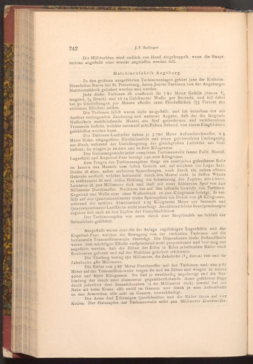Jede diefer Turbinen ift conftruirt für 762 Meter Gefälle( davon 2/ faugend, Druck) und 16 14 Cubikmeter Waffer per Secunde, und foll dabei bei 50 Umdrehungen per Minute effectiv 1200 Pferdeftärken( 73 Percent des abfoluten Effectes) leiften.