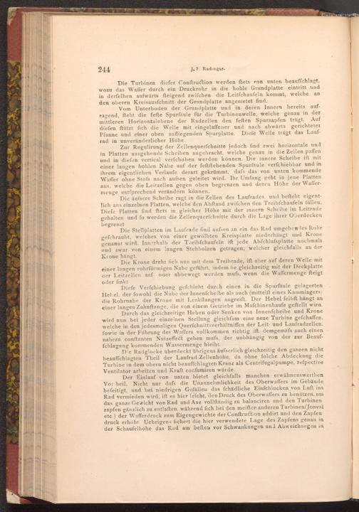 Der Einlauf von unten bietet gleichfalls manchen erwähnenswerthen Vor heil. Nicht nur dafs die Unannehmlichkeit des Oberwaffers im Gebäude befeitigt, und bei niedrigen Gefällen das fchädliche Einfchlucken von Luft ins Rad vermieden wird, ift es hier leicht, den Druck des Oberwaffers zu benützen, um das ganze Gewicht von Rad und Axe vollſtändig zu balanciren und den Turbinen zapfen gänzlich zu entlaften. während fich bei den meifter anderen Turbinen( Jonval etc.) der Wafferdruck zum Eigengewichte der Conftruction addirt und den Zapfendruck erhöht. Uebrigens fichert die hier verwendete Lage des Zapfens genau in der Schaufelhöhe das Rad am befteu vor Schwankungen und Abweichungen in