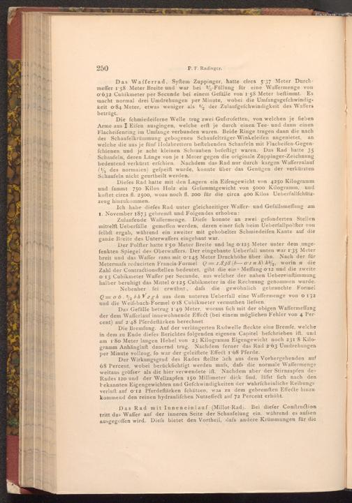 Der Wirkungsgrad des Rades ftellte ich aus dem Vorhergehenden auf 68 Percent, wobei berücksichtigt werden mufs, dafs die normale Waffermenge weitaus gröfser als die hier verwendete ift. Nachdem aber der Stirnzapfen des Rades 120 und der Wellzapfen 150 Millimeter dick find, läfst fich nach den bekannten Eigengewichten und Gefchwindigkeiten der wahrfcheinliche Reibungs verluft auf o 12 Pferdeftärken fchätzen, was zu dem gebremften Effecte hinzukommend den reinen hydraulifchen Nutzeffect auf 72 Percent erhöht.