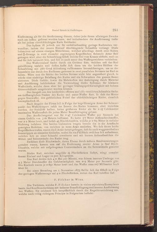 Das Rad drehte fich 4 0 Mal per Minute, was feinem inneren Umfange von 43 Meter Durchmeffer die Gefchwindigkeit von o'9 Meter per Secunde gibt. Die Einläufe waren je o 857 Meter breit und das Waffer rann 107 Millimeter hoch über fie.