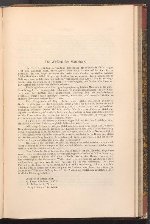 Die Möglichkeit der fofortigen Ingangfetzung folcher Mafchinen, der gänzliche Mangel jeder Feuersgefahr oder anderer Unannehmlichkeiten für die Nachbarn und der Entfall einer andauernden Wartung find ihre entfchiedenen Vortheile, welche noch gefteigert werden, wenn das abftrömende Waffer zu anderen Zwecken weiters benützt wird.