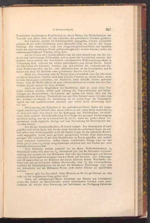 Auch die leichte Möglichkeit des Nachfehens mufs als einer ihrer Vortheile erwähnt werden, indem nach Lüftung der Traversfchraube und Ueberfchlagen des Hebelrahmens der Cylinder mit diefem fich heben läfst und die Schieberflächen blofslegt. Thatfächlich hub mir Herr Schmid einen Cylinder vom Sitz welcher von Beginn der Ausftellung bis zu jenem Tage( 22. September) täglich und faft ununterbrochen arbeitete und wobei keine Abnützung ficht