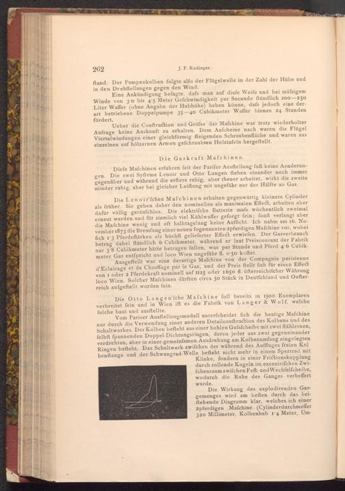 Die Lenoir'fchen Mafchinen erhalten gegenwärtig kleinere Cylinder als früher. Sie geben daher den nominellen als maximalen Effect, arbeiten aber dafür völlig geräufchlos. Die elektriſche Batterie mufs wöchentlich zweimal erneut werden und für ziemlich viel Kühlwaffer geforgt fein; fonft verlangt aber die Mafchine wenig und oft halbtagelang keine Aufficht. Ich nahm am 16. November 1873 die Bremfung einer neuen fogenannten 2pferdigen Mafchine vor, wobei fich 13 Pferdeftärken als höchft gelieferter Effect erwiefen. Der Gasverbrauch betrug dabei ftündlich 6 Cubikmeter, während er laut Preiscourant der Fabrik nur 3.8 Cubikmeter hätte betragen follen, was per Stunde und Pferd 4.6 Cubikmeter Gas entspricht und loco Wien ungefähr fl. o 50 koftet.