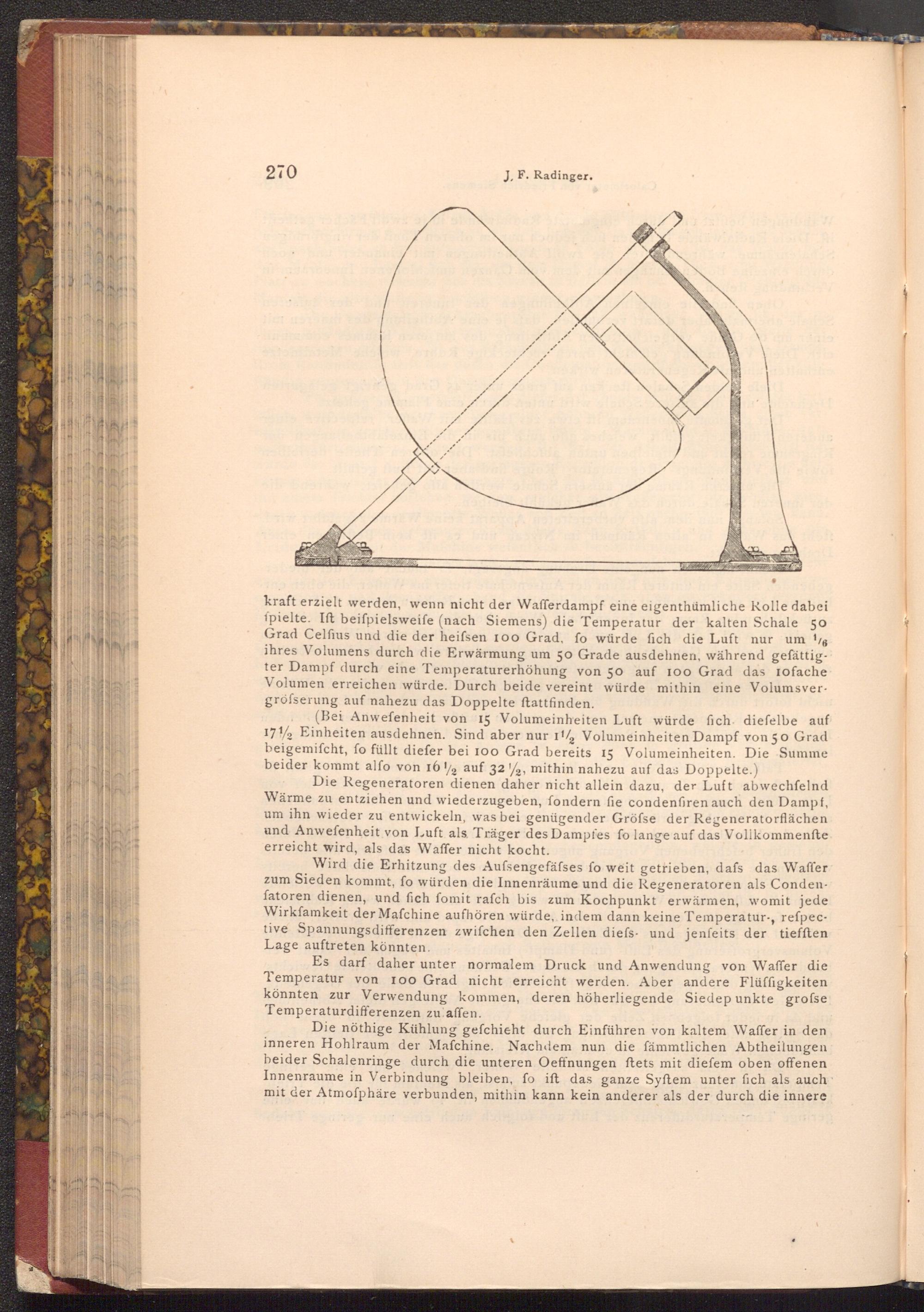 kraft erzielt werden, wenn nicht der Wafferdampf eine eigenthümliche Rolle dabei fpielte. Ift beiſpielsweife( nach Siemens) die Temperatur der kalten Schale 50 Grad Celfius und die der heifsen 100 Grad, fo würde fich die Luft nur ihres Volumens durch die Erwärmung um 50 Grade ausdehnen, während gefättigter Dampf durch eine Temperaturerhöhung von 50 auf 100 Grad das 1ofache Volumen erreichen würde. Durch beide vereint würde mithin eine Volumsvergröfserung auf nahezu das Doppelte ftattfinden.