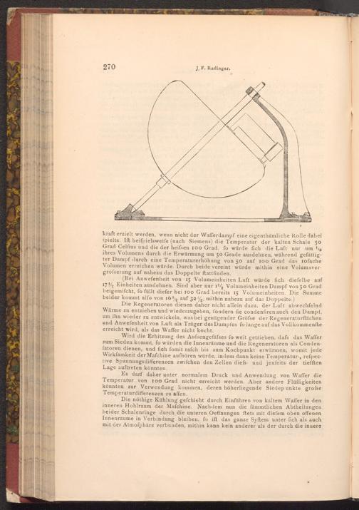 Wird die Erhitzung des Aufsengefäfses fo weit getrieben, dafs das Waffer zum Sieden kommt, fo würden die Innenräume und die Regeneratoren als Condenfatoren dienen, und fich fomit rafch bis zum Kochpunkt erwärmen, womit jede Wirkfamkeit der Mafchine aufhören würde, indem dann keine Temperatur-, refpective Spannungsdifferenzen zwifchen den Zellen diefs- und jenfeits der tiefften Lage auftreten könnten.