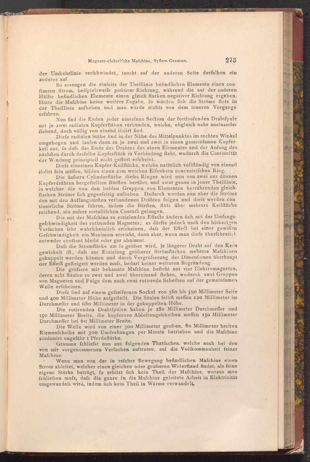 Dafs die Stromftärke um fo gröfser wird, je längerer Draht auf den Kern gewickelt ift, dafs zur Erzielung gröfserer Strömftärken mehrere Maſchinen gekuppelt werden können und durch Vergrösserung der Dimenfionen überhaupt der Effect gefteigert werden mufs, bedarf keiner weiteren Begründung.