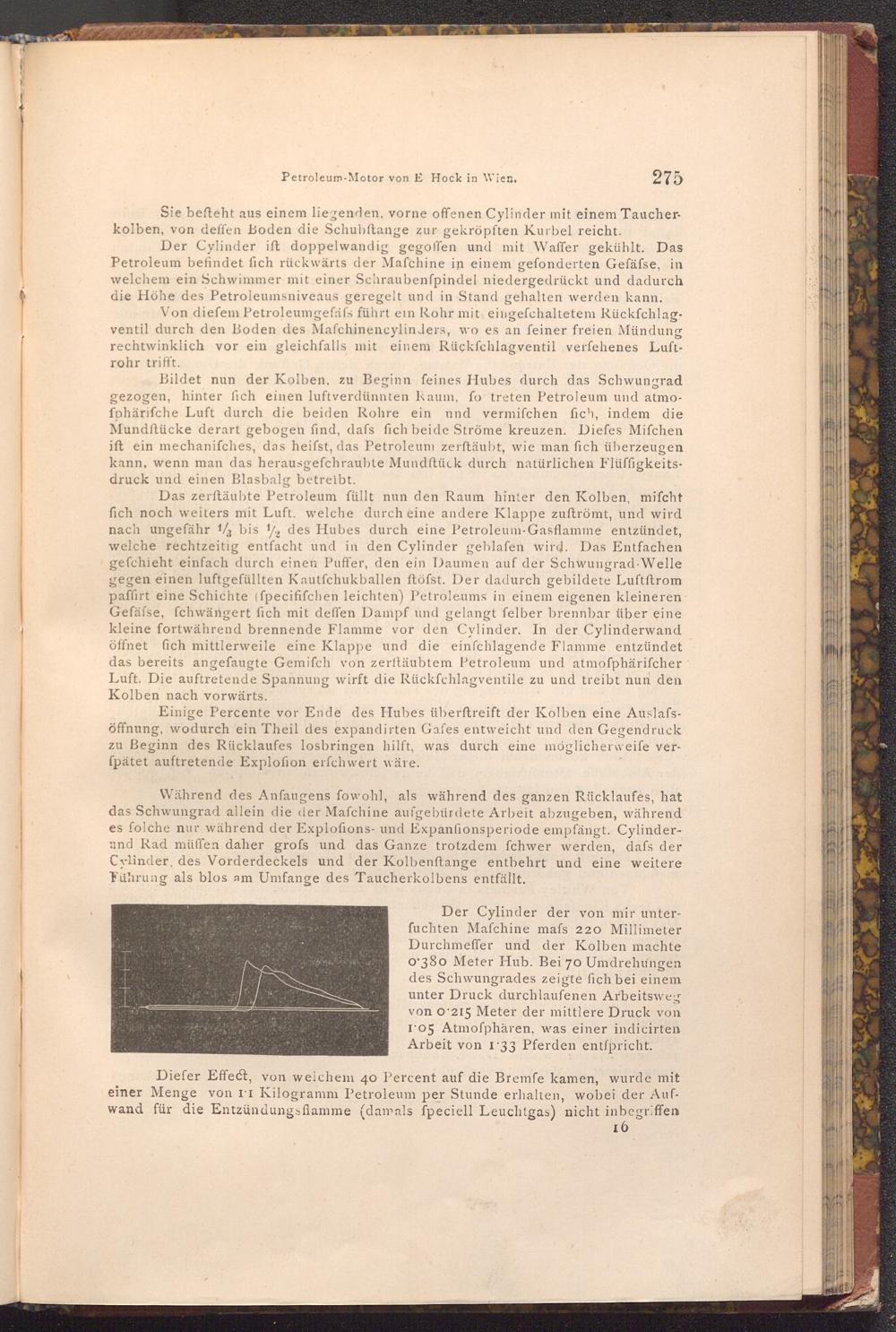 Das zerftäubte Petroleum füllt nun den Raum hinter den Kolben, mifcht fich noch weiters mit Luft. welche durch eine andere Klappe zuftrömt, und wird nach ungefähr 1/3 bis 12 des Hubes durch eine Petroleum- Gasflamme entzündet, welche rechtzeitig entfacht und in den Cylinder geblafen wird. Das Entfachen gefchieht einfach durch einen Puffer, den ein Daumen auf der Schwungrad Welle gegen einen luftgefüllten Kautfchukballen ftöfst. Der dadurch gebildete Luftftrom paffirt eine Schichte( fpecififchen leichten) Petroleums in einem eigenen kleineren Gefäfse, fchwängert fich mit deffen Dampf und gelangt felber brennbar über eine kleine fortwährend brennende Flamme vor den Cylinder. In der Cylinderwand öffnet fich mittlerweile eine Klappe und die einfchlagende Flamme entzündet das bereits angefaugte Gemifch von zerftäubtem Petroleum und atmoſphärifcher Luft. Die auftretende Spannung wirft die Rückfchlagventile zu und treibt nun den Kolben nach vorwärts.