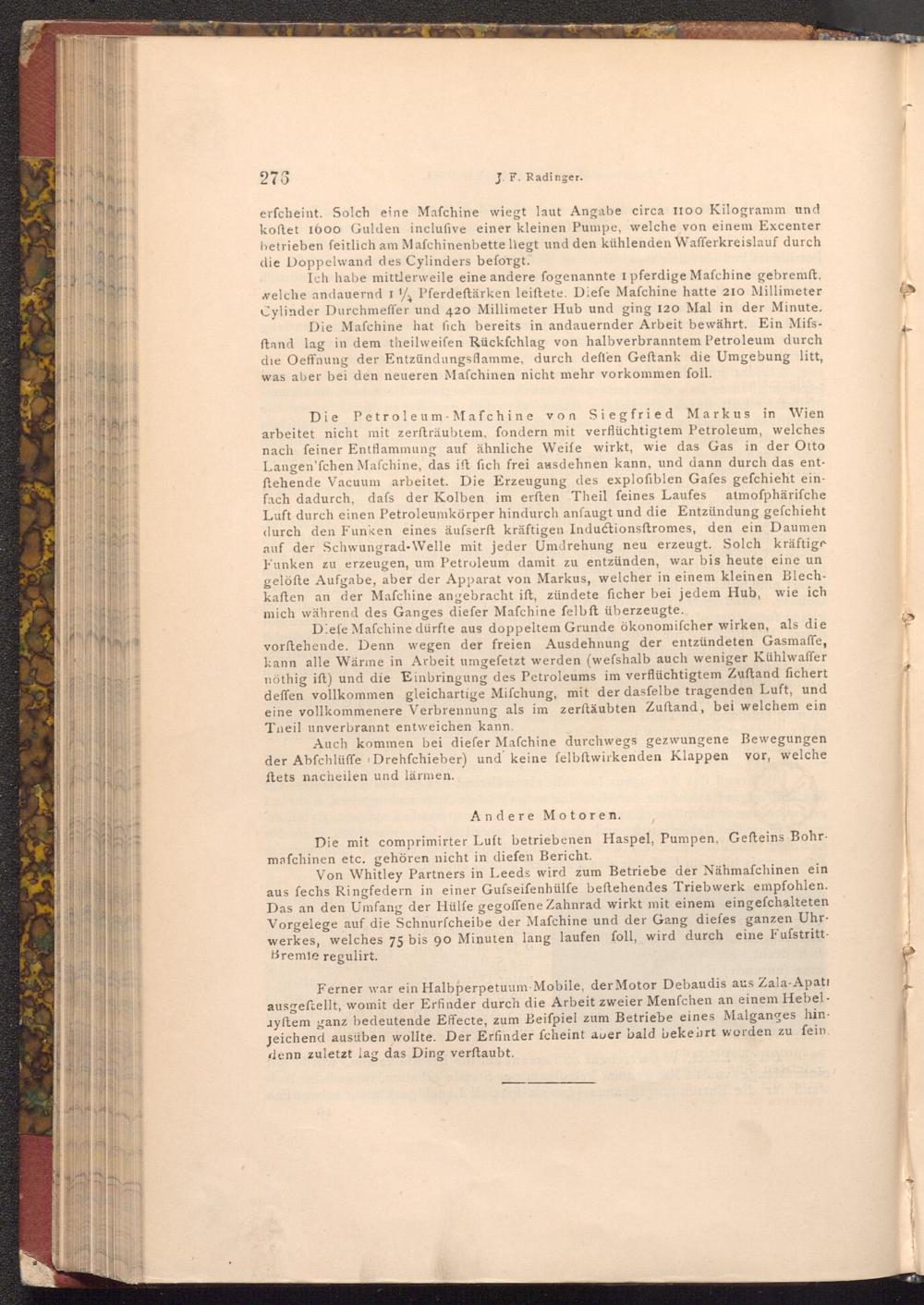 Die Petroleum Mafchine von Siegfried Markus in Wien arbeitet nicht mit zerfträubtem, fondern mit verflüchtigtem Petroleum, welches nach feiner Entflammung auf ähnliche Weife wirkt, wie das Gas in der Otto Langen'fchen Mafchine, das ift fich frei ausdehnen kann, und dann durch das entftehende Vacuum arbeitet. Die Erzeugung des explofiblen Gafes gefchieht einfach dadurch, dafs der Kolben im erften Theil feines Laufes atmoſphärifche Luft durch einen Petroleumkörper hindurch anfaugt und die Entzündung gefchieht durch den Funken eines äufserft kräftigen Inductionsftromes, den ein Daumen auf der Schwungrad- Welle mit jeder Umdrehung neu erzeugt. Solch kräftige Funken zu erzeugen, um Petroleum damit zu entzünden, war bis heute eine un gelöfte Aufgabe, aber der Apparat von Markus, welcher in einem kleinen Blechkaften an der Mafchine angebracht ift, zündete ficher bei jedem Hub, wie ich mich während des Ganges diefer Mafchine felbft überzeugte.