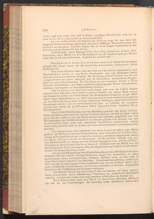Diefe Bremfe, deren Eigengewichte fich völlig balanciren, konnte halbftundenlang einen Effect von 18 5 Pferdeftärken bei 140 Umdrehungen per Minute ohne fich zu erhitzen aufnehmen, obgleich fie trocken lief.