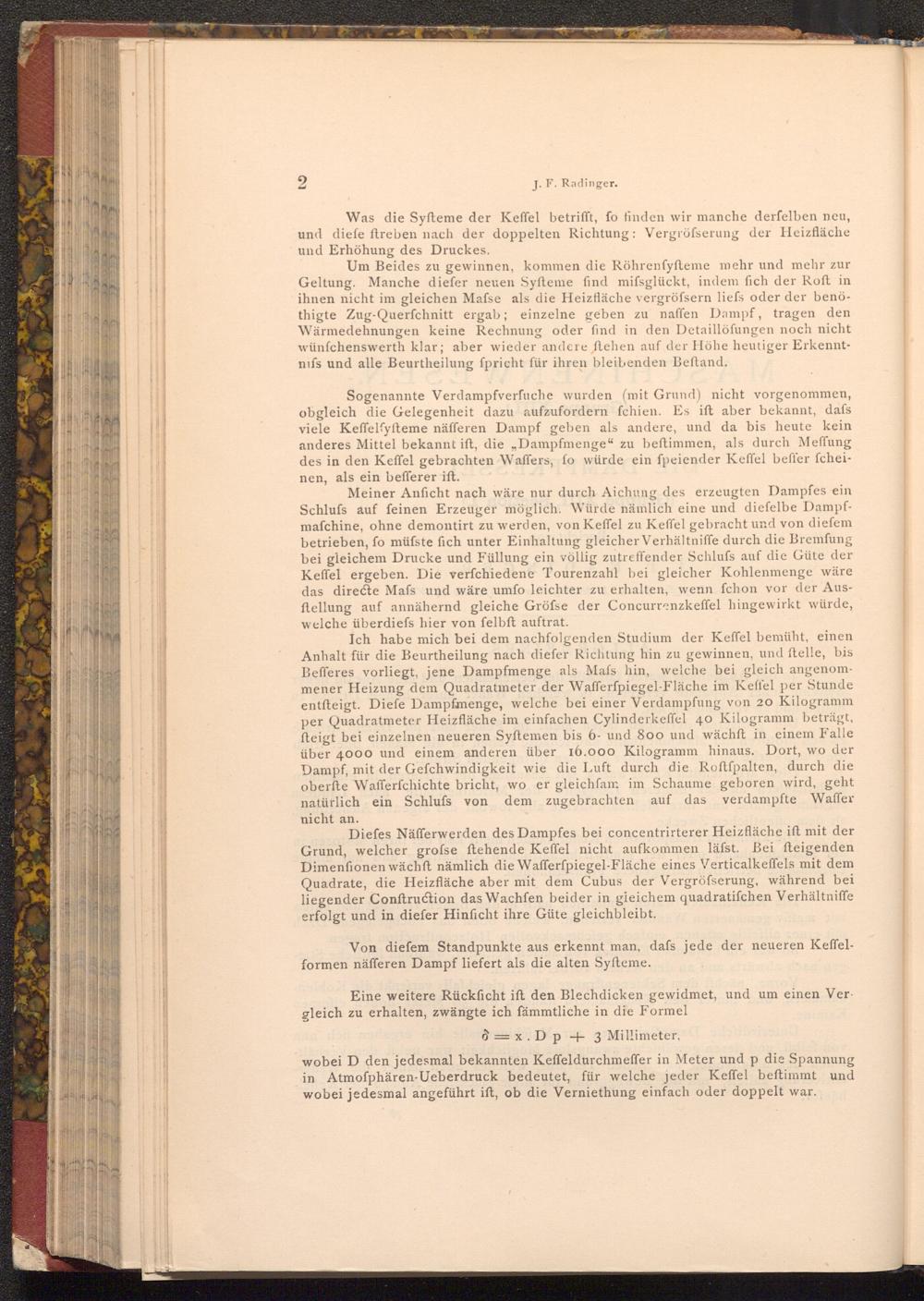 Ich habe mich bei dem nachfolgenden Studium der Keffel bemüht, einen Anhalt für die Beurtheilung nach diefer Richtung hin zu gewinnen, und ftelle, bis Befferes vorliegt, jene Dampfmenge als Mafs hin, welche bei gleich angenommener Heizung dem Quadratmeter der Wafferfpiegel- Fläche im Keffel per Stunde entfteigt. Diefe Dampfmenge, welche bei einer Verdampfung von 20 Kilogramm per Quadratmeter Heizfläche im einfachen Cylinderkeffel 40 Kilogramm beträgt, fteigt bei einzelnen neueren Syftemen bis 6- und 800 und wächft in einem Falle über 4000 und einem anderen über 16.000 Kilogramm hinaus. Dort, wo der Dampf, mit der Gefchwindigkeit wie die Luft durch die Roftfpalten, durch die oberfte Wafferfchichte bricht, wo er gleichfam im Schaume geboren wird, geht natürlich ein Schlufs von dem zugebrachten auf das verdampfte Waffer nicht an.
