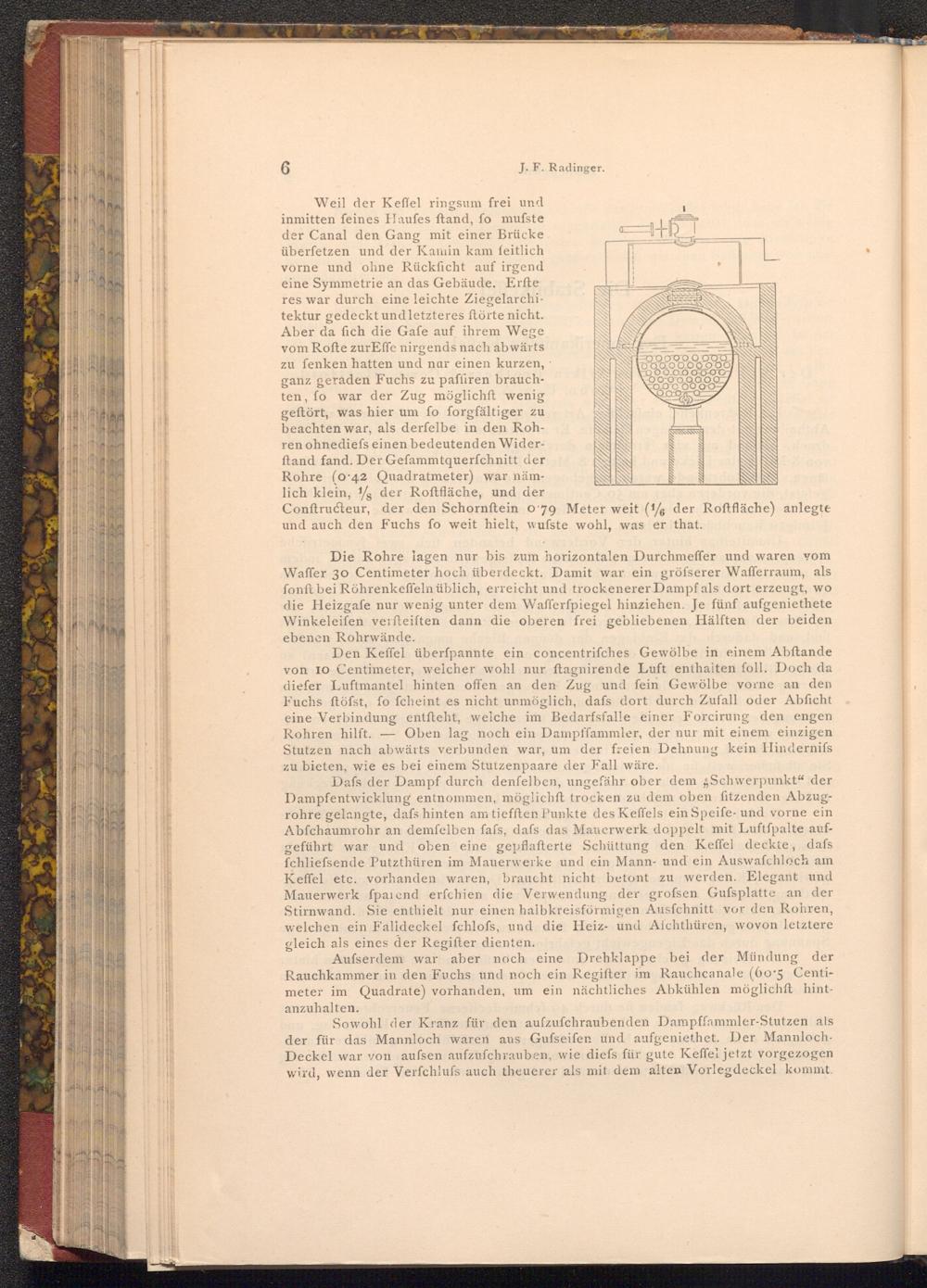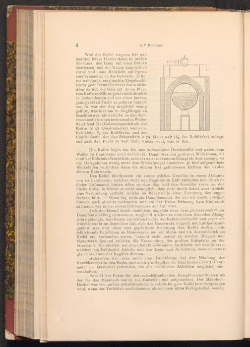 Den Keffel überfpannte ein concentrifches Gewölbe in einem Abftande von 10 Centimeter, welcher wohl nur ftagnirende Luft enthalten foll. Doch da diefer Luftmantel hinten offen an den Zug und fein Gewölbe vorne an den Fuchs ftöfst, fo fcheint es nicht unmöglich, dafs dort durch Zufall oder Abficht eine Verbindung entſteht, welche im Bedarfsfalle einer Forcirung den engen Rohren hilft. Oben lag noch ein Dampffammler, der nur mit einem einzigen Stutzen nach abwärts verbunden war, um der freien Dehnung kein Hindernifs zu bieten, wie es bei einem Stutzenpaare der Fall wäre.