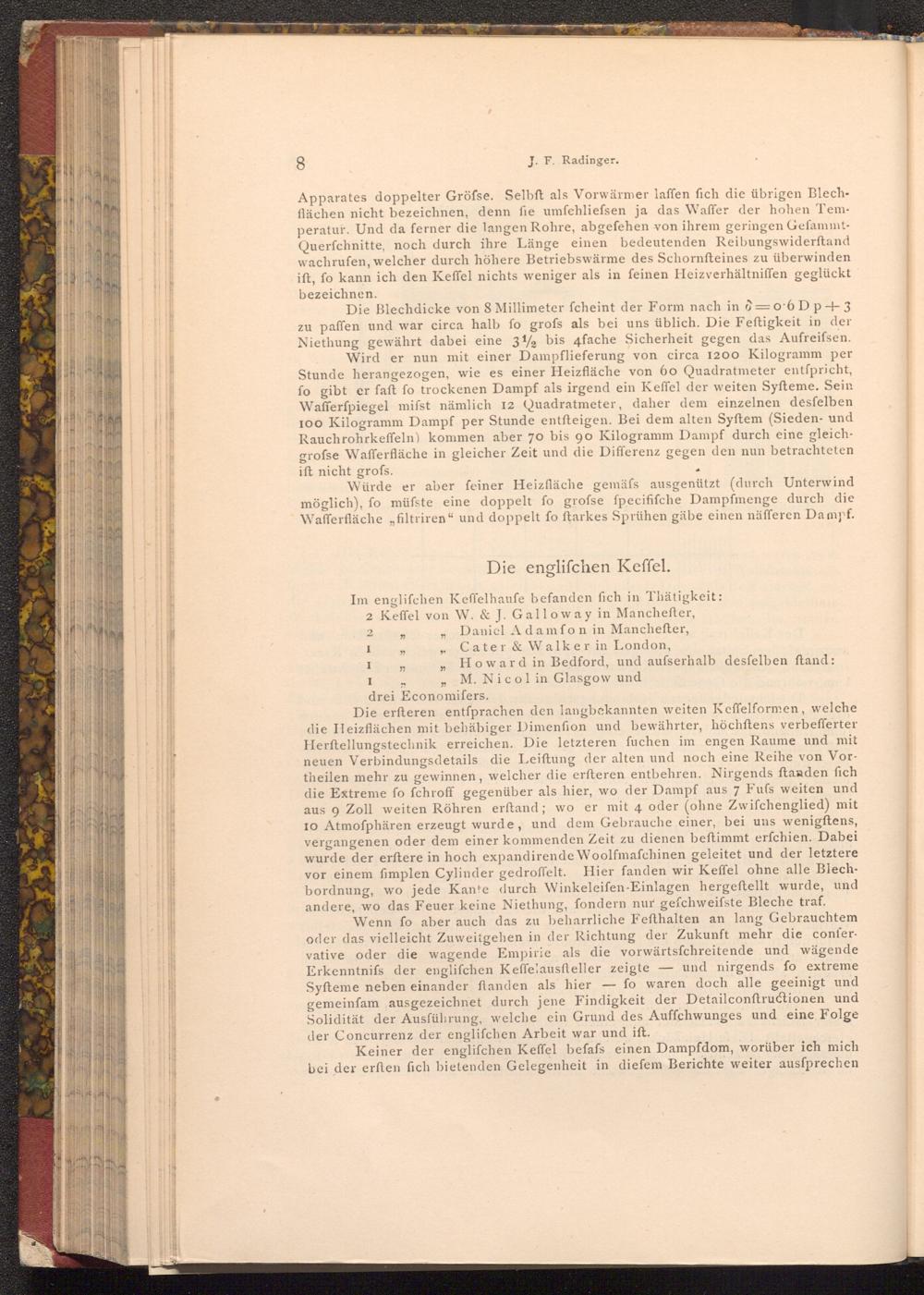 Wenn fo aber auch das zu beharrliche Fefthalten an lang Gebrauchtem oder das vielleicht Zuweitgehen in der Richtung der Zukunft mehr die confer vative oder die wagende Empirie als die vorwärtsfchreitende und wägende Erkenntnifs der englifchen Keffelausfteller zeigte und nirgends fo extreme Syfteme neben einander flanden als hier fo waren doch alle geeinigt und gemeinfam ausgezeichnet durch jene Findigkeit der Detail conftructionen und Solidität der Ausführung, welche ein Grund des Auffchwunges und eine Folge der Concurrenz der englifchen Arbeit war und ift.