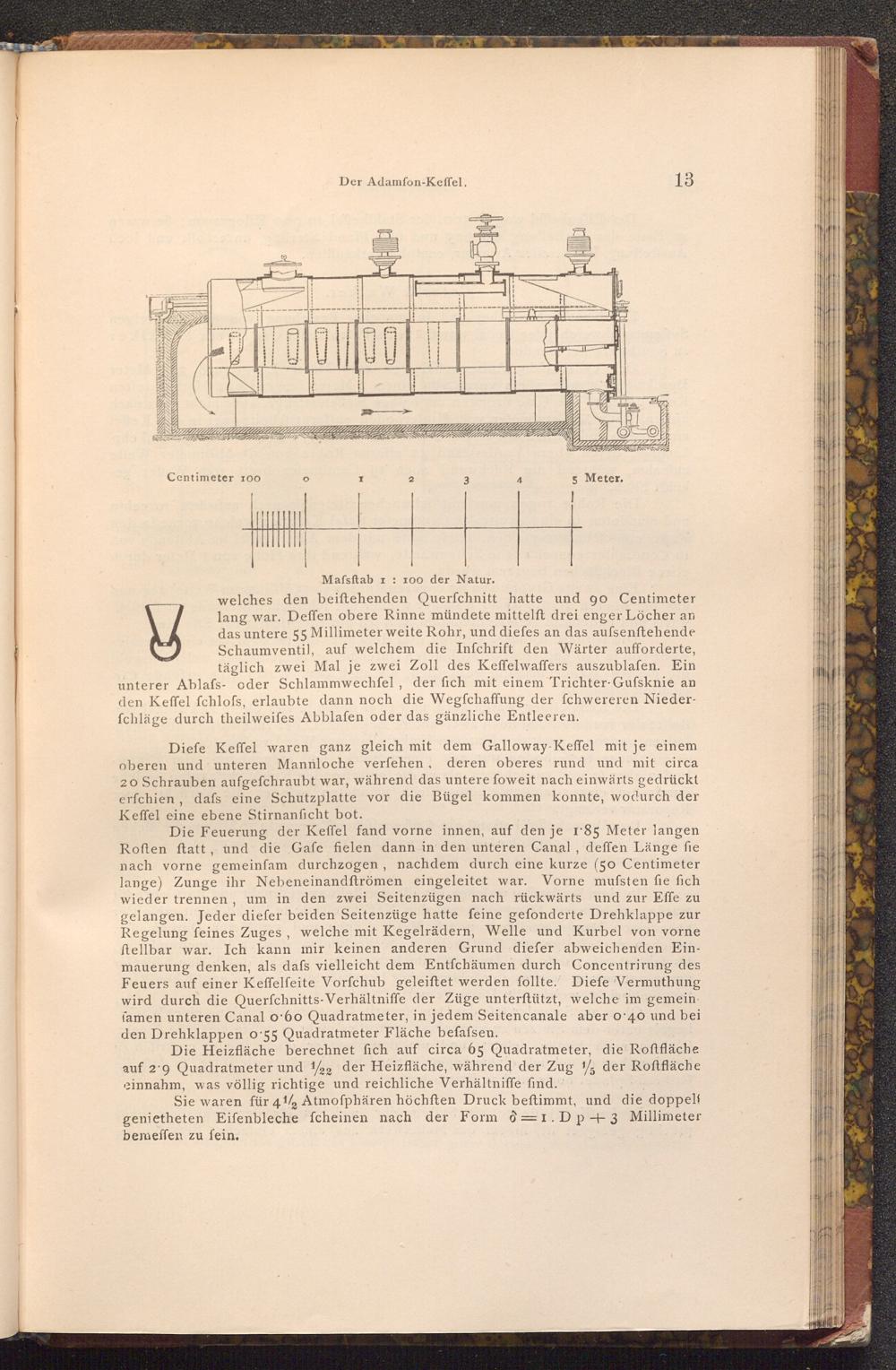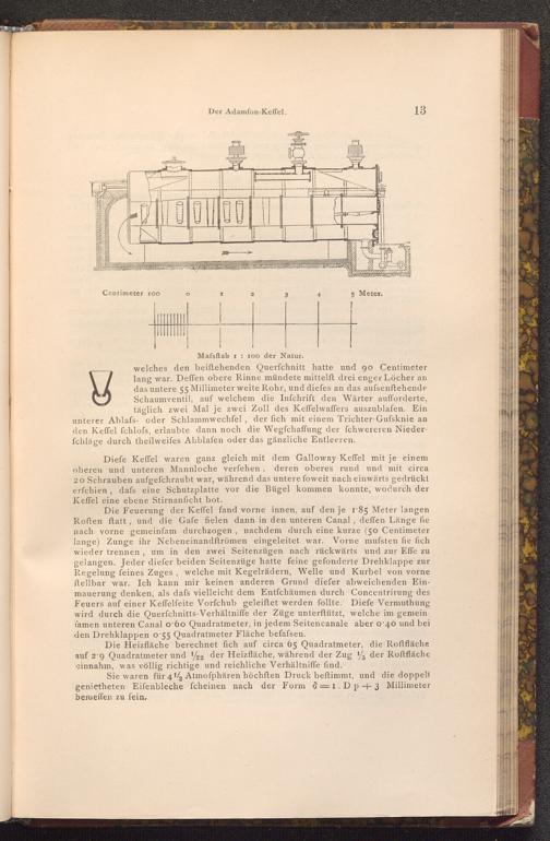 Diefe Keffel waren ganz gleich mit dem Galloway- Keffel mit je einem oberen und unteren Mannloche verfehen, deren oberes rund und mit circa 20 Schrauben aufgefchraubt war, während das untere foweit nach einwärts gedrückt erfchien, dafs eine Schutzplatte vor die Bügel kommen konnte, wodurch der Keffel eine ebene Stirnanficht bot.