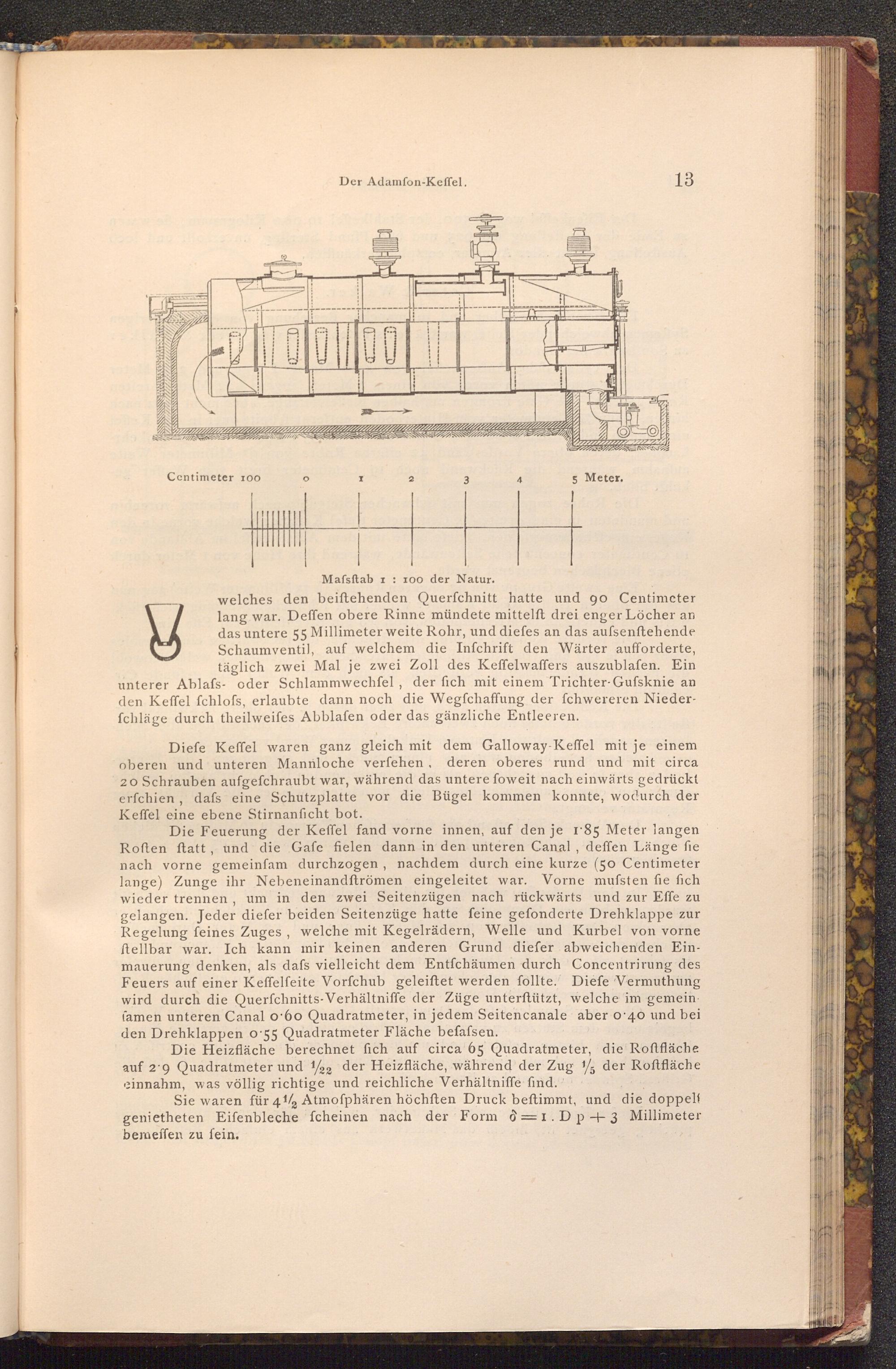 Die Feuerung der Keffel fand vorne innen, auf den je 185 Meter langen Roften ftatt, und die Gafe fielen dann in den unteren Canal, deffen Länge fie nach vorne gemeinfam durchzogen, nachdem durch eine kurze( 50 Centimeter lange) Zunge ihr Nebeneinandftrömen eingeleitet war. Vorne mufsten fie fich wieder trennen, um in den zwei Seitenzügen nach rückwärts und zur Effe zu gelangen. Jeder diefer beiden Seitenzüge hatte feine gefonderte Drehklappe zur Regelung feines Zuges, welche mit Kegelrädern, Welle und Kurbel von vorne ftellbar war. Ich kann mir keinen anderen Grund diefer abweichenden Einmauerung denken, als dafs vielleicht dem Entfchäumen durch Concentrirung des Feuers auf einer Keffelfeite Vorfchub geleiftet werden follte. Diefe Vermuthung wird durch die Querfchnitts- Verhältniffe der Züge unterſtützt, welche im gemein famen unteren Canal o 60 Quadratmeter, in jedem Seiten canale aber o 40 und bei den Drehklappen o 55 Quadratmeter Fläche befassen.