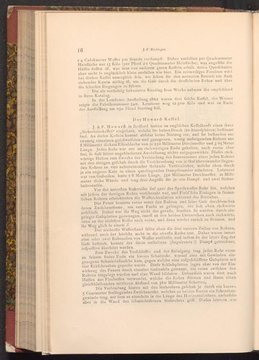 J.& F. Howard in Bedford hatten im englifchen Keffelhaufe einen ihrer Sicherheitskeffel" eingebaut, welche für hohen Druck( 10 Atmofphären) beftimmt find. An diefen Keffeln kommt abfolut keine Nietung vor, und fie beftanden aus zwanzig einzelnen gefchweifsten und gezogenen, wenig anfteigenden Rohren aus 8 Millimeter dickem Eifenbleche von je 230 Millimeter Durchmeffer und 3.65 Meter Länge. Jedes Rohr war nur am rückwärtigen Ende gehalten, nach vorne aber frei, fo dafs feiner ungehinderten Ausdehnung nichts entgegenwirkte. Diefes rückwärtige Halten zum Zwecke der Verbindung des Innenraumes eines jeden Rohres mit den übrigen gefchah durch die Verfchraubung von je fünf übereinander liegenden Rohren an vier nebeneinander ftehende Verticalrohre, welche oben durch je ein engeres Knie in einen querliegenden Dampffammler mündeten. Letzterer war von Gufseifen, hatte 18 Meter Länge, 350 Millimeter Durchmeffer, 21 Millimeter dicke Wände und trug drei Angüffe für je ein Dampf- und zwei Sicherheitsventile.