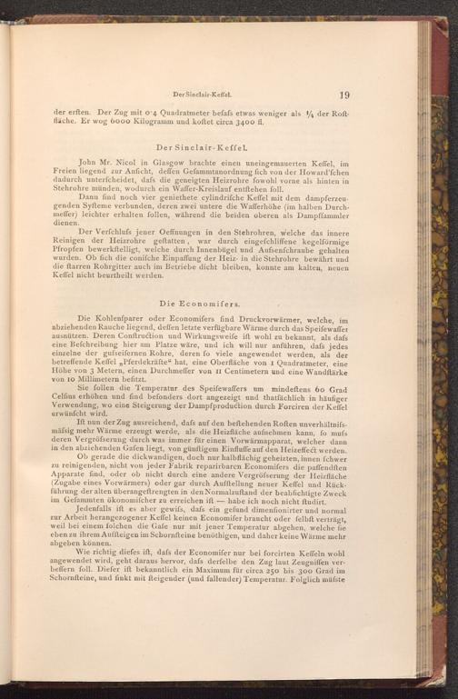 Jedenfalls ift es aber gewifs, dafs ein gefund dimenfionirter und normal zur Arbeit herangezogener Keffel keinen Economifer braucht oder felbft verträgt, weil bei einem folchen die Gafe nur mit jener Temperatur abgehen, welche fie eben zu ihrem Auffteigen im Schornfteine benöthigen, und daher keine Wärme mehr abgeben können.