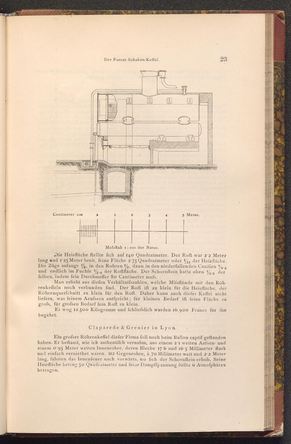 Ein grofser Röhrenkeffel diefer Firma foll noch beim Ballon captif geftanden haben. Er beftand, wie ich authentifch vernahm, aus einem 2'1 weiten Aufsen- und einem 0.95 Meter weiten Innenrohre, deren Bleche 17 6 und 16 5 Millimeter ftark und einfach verniethet waren. 112 Gegenrohre, à 70 Millimeter weit und 2.2 Meter lang, führten das Innenfeuer nach vorwärts, wo fich der Schornftein erhob. Seine Heizfläche betrug 50 Quadratmeter und feine Dampffpannung follte 6 Atmoſphären betragen.