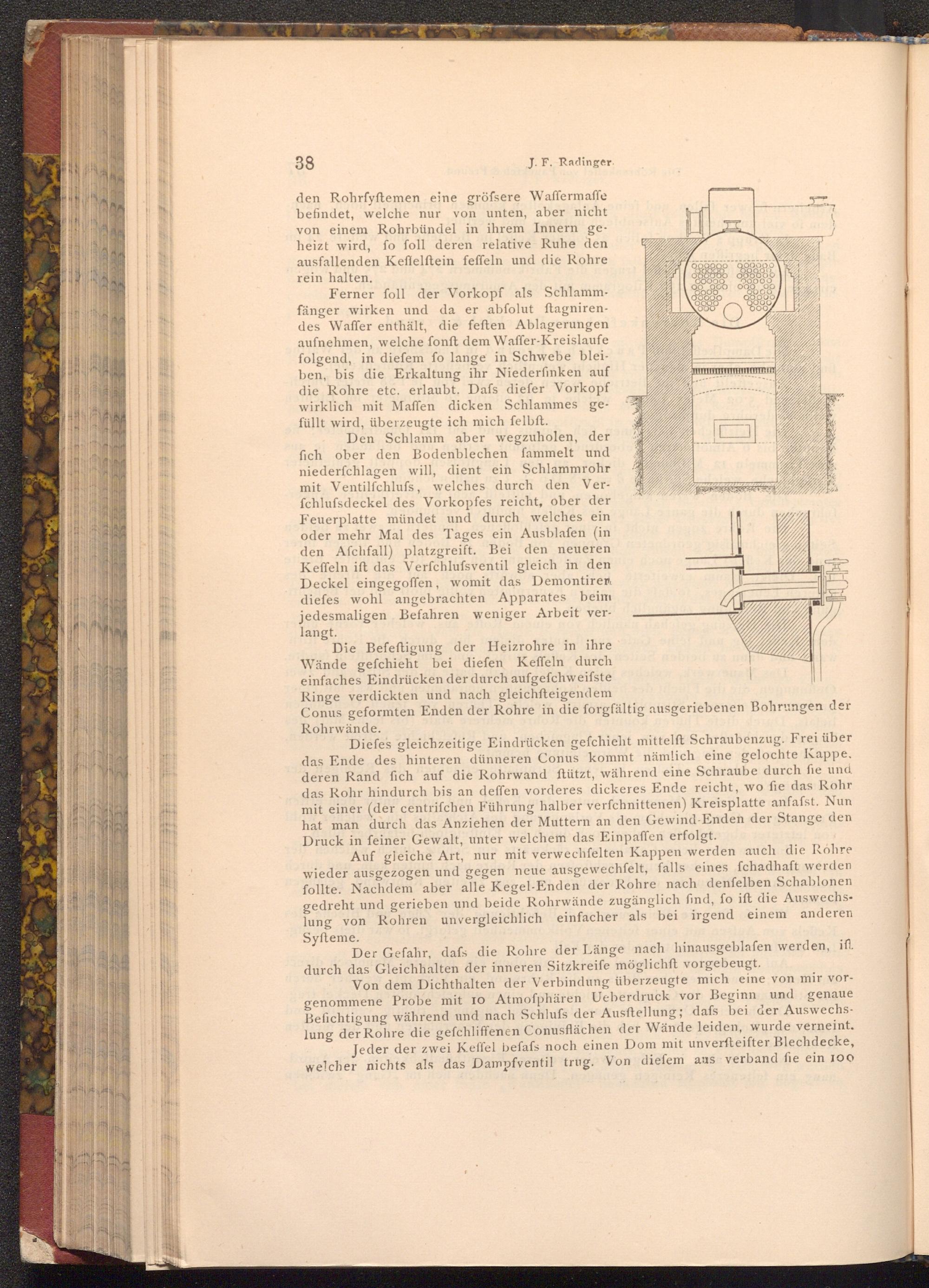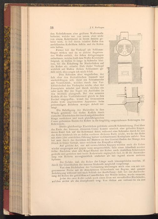 Ferner foll der Vorkopf als Schlammfänger wirken und da er abfolut ftagnirendes Waffer enthält, die feften Ablagerungen aufnehmen, welche fonft dem Waffer- Kreislaufe folgend, in diefem fo lange in Schwebe bleiben, bis die Erkaltung ihr Niederfinken auf die Rohre etc. erlaubt. Dafs diefer Vorkopf wirklich mit Maffen dicken Schlammes gefüllt wird, überzeugte ich mich felbft.