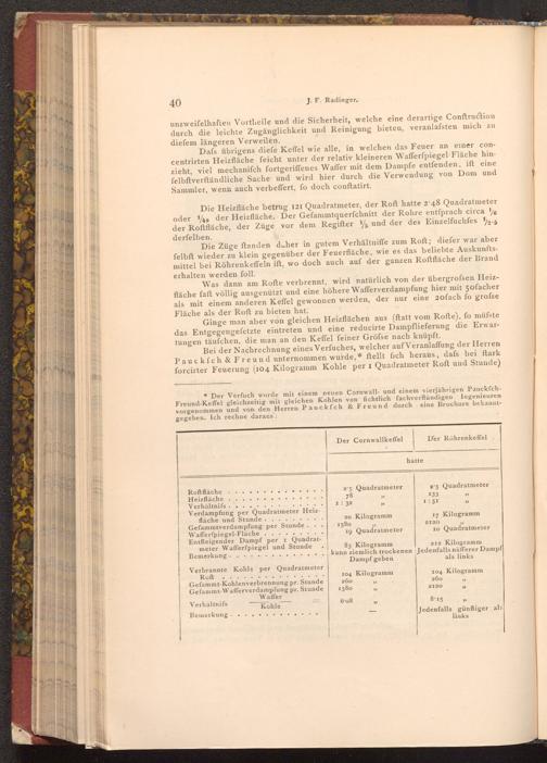 Die Heizfläche betrug 121 Quadratmeter, der Roft hatte 2'48 Quadratmeter oder 149 der Heizfläche. Der Gefammtquerfchnitt der Rohre entſprach circa 1/6 der Roftfläche, der Züge vor dem Regiſter 1 und der des Einzelfuchfes 12.5 derfelben.