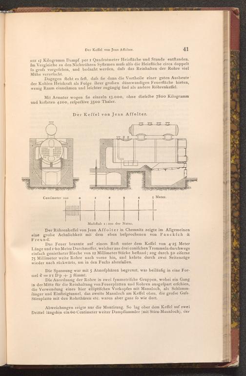 Dagegen fteht es feft, dafs fie dann die Vortheile einer guten Ausbeute der Kohlen Heizkraft als Folge ihrer grofsen dünnwandigen Feuerfläche bieten, wenig Raum einnehmen und leichter zugängig find als andere Röhrenkeffel.