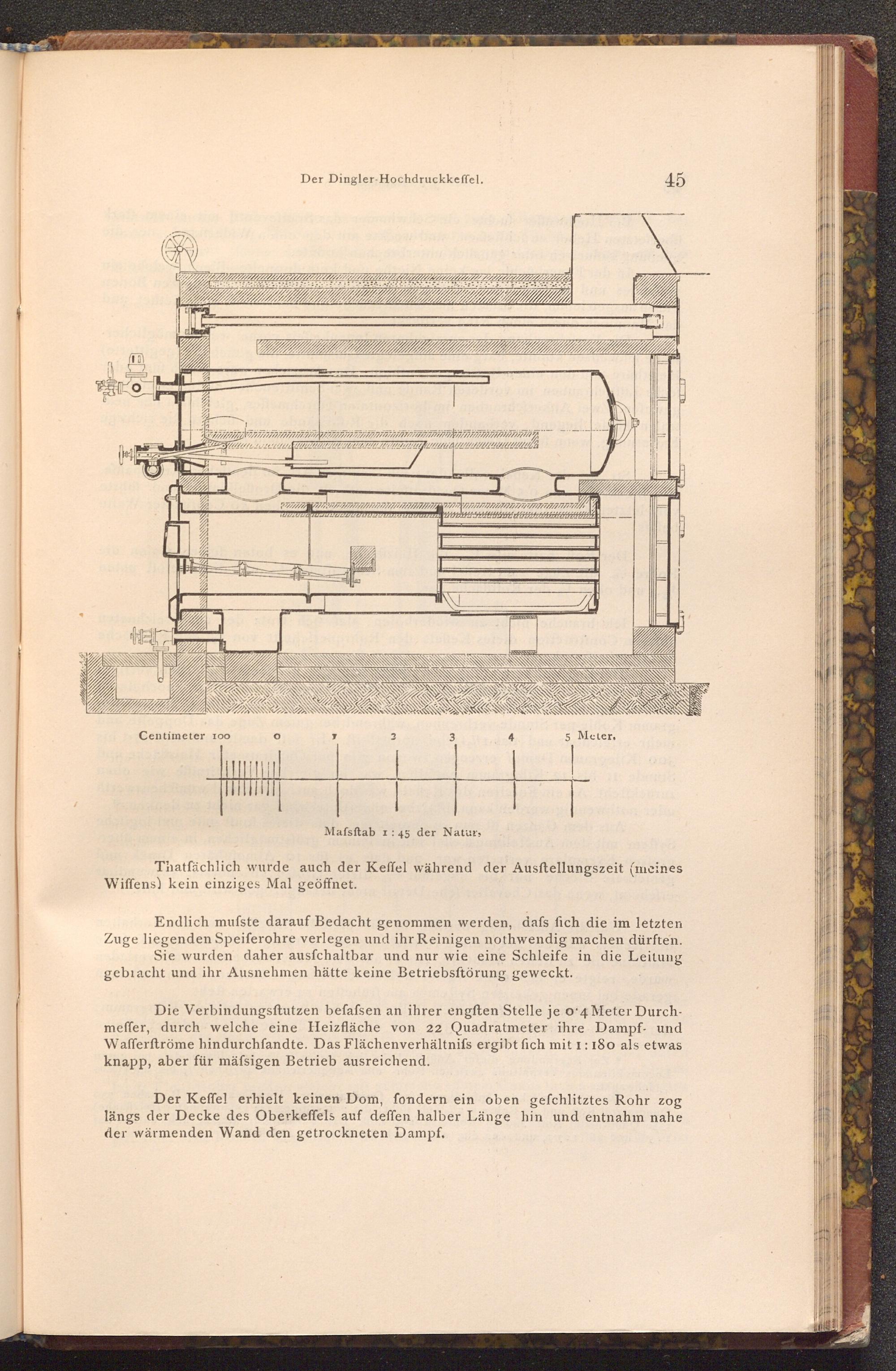 Die Verbindungsftutzen befafsen an ihrer engften Stelle je o 4 Meter Durchmeffer, durch welche eine Heizfläche von 22 Quadratmeter ihre Dampf- und Wafferftröme hindurchfandte. Das Flächenverhältnifs ergibt fich mit 1: 180 als etwas knapp, aber für mäfsigen Betrieb ausreichend.