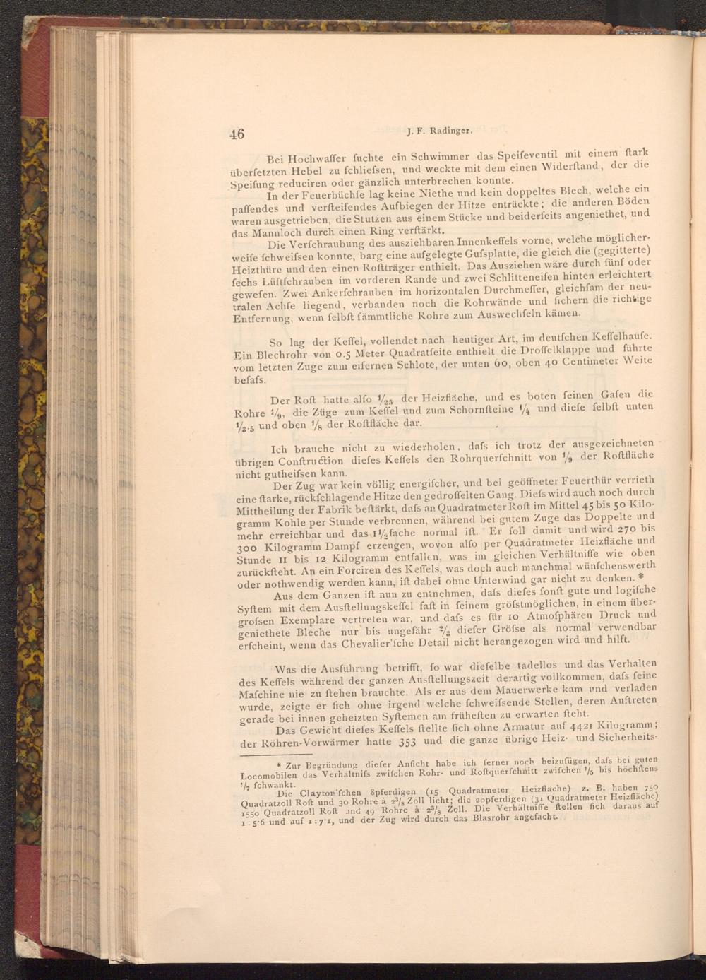 * Zur Begründung diefer Anficht habe ich ferner noch beizufügen, dafs bei guten Locomobilen das Verhältnifs zwifchen Rohr- und Roftquerfchnitt zwifchen 1/5 bis höchftens 1½ fchwankt. Die Clayton'fchen Spferdigen( 15 Quadratmeter Heizfläche) z. B. haben 750 Quadratzoll Roft und 30 Rohre à 23% Zoll licht; dic 20pferdigen( 31 Quadratmeter Heizfläche) 1550 Quadratzoll Roft and 49 Rohre à 23 Zoll. Die Verhältniffe ftellen fich daraus auf 1: 5'6 und auf 1: 7'1, und der Zug wird durch das Blasrohr angefacht.