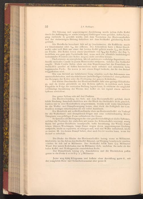 Die Heizfläche berechnet fich auf 55 Quadratmeter, die Roftfläche macht 2'2 Quadratmeter oder 1/25 der erfteren. Der Schornftein hatte I Meter Durch meffer oder weil ftets nur einer der beiden Keffel geheizt wurde 12.8 des Roftes zur Fläche. Die Rohre boten einen Querfchnitt von 1.6 des Roftes, der Zug 1 desfelben, was ganz gute Verhältniffe find, wenn auch ein allenfalls beabfichtigtes bedeutendes Forciren( der Rohre wegen) nicht zutreffen könnte.