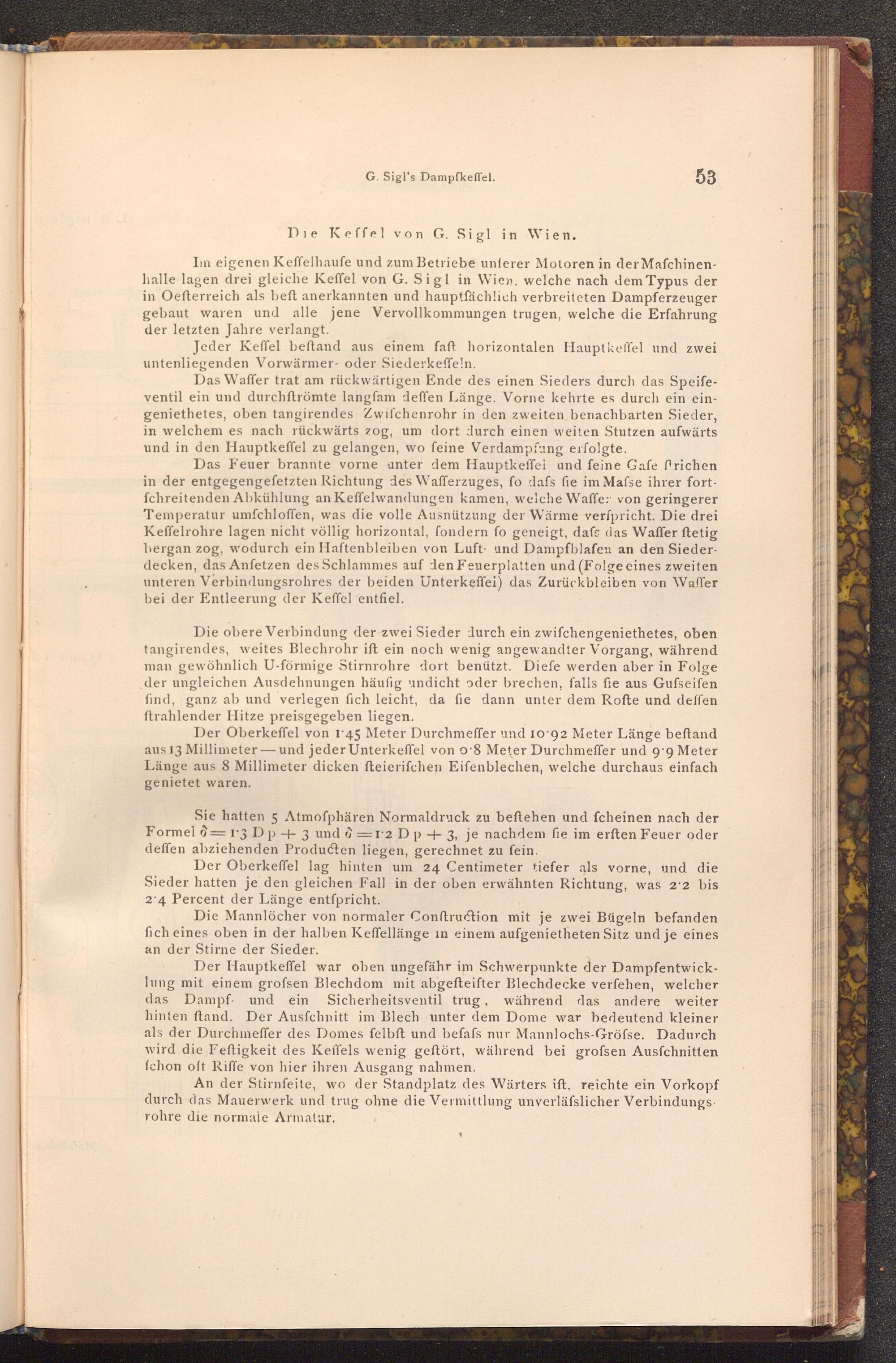 Im eigenen Keffelhaufe und zum Betriebe unferer Motoren in der Mafchinenhalle lagen drei gleiche Keffel von G. Sigl in Wien, welche nach dem Typus der in Oefterreich als beft anerkannten und hauptfächlich verbreiteten Dampferzeuger gebaut waren und alle jene Vervollkommungen trugen, welche die Erfahrung der letzten Jahre verlangt.