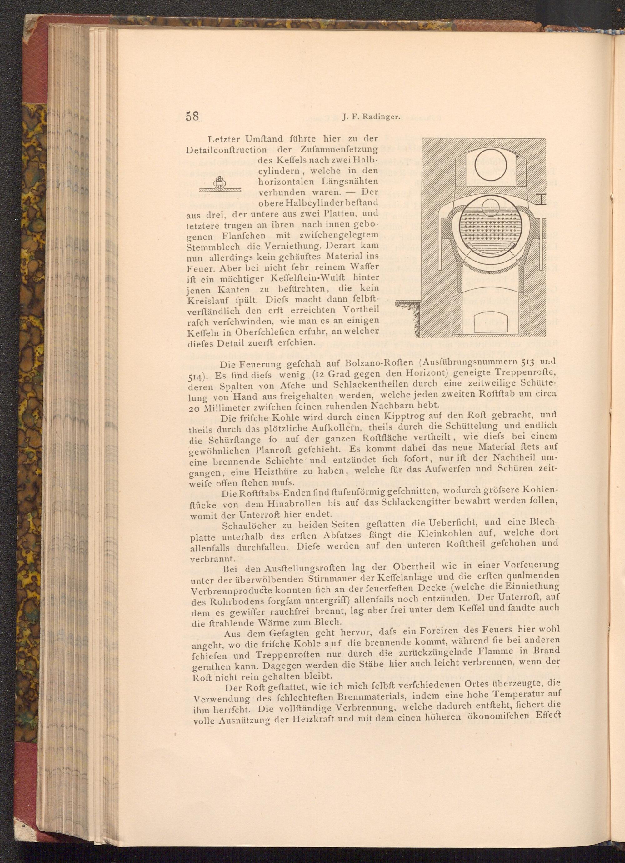 Die Feuerung gefchah auf Bolzano- Roften( Ausführungsnummern 513 und 514). Es find diefs wenig( 12 Grad gegen den Horizont) geneigte Treppenrcfte, deren Spalten von Afche und Schlackentheilen durch eine zeitweilige Schüttelung von Hand aus freigehalten werden, welche jeden zweiten Roftftab um circa 20 Millimeter zwifchen feinen ruhenden Nachbarn hebt.