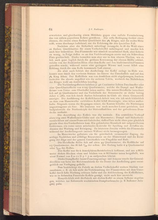 Die Heizfläche ftellte fich auf circa 44 Quadratmeter, die Roftfläche auf 15 Quadratmeter, das ift faft 10 der erften. Der Endzug hatte o 4 Quadratmeter oder 18 des Roftes.