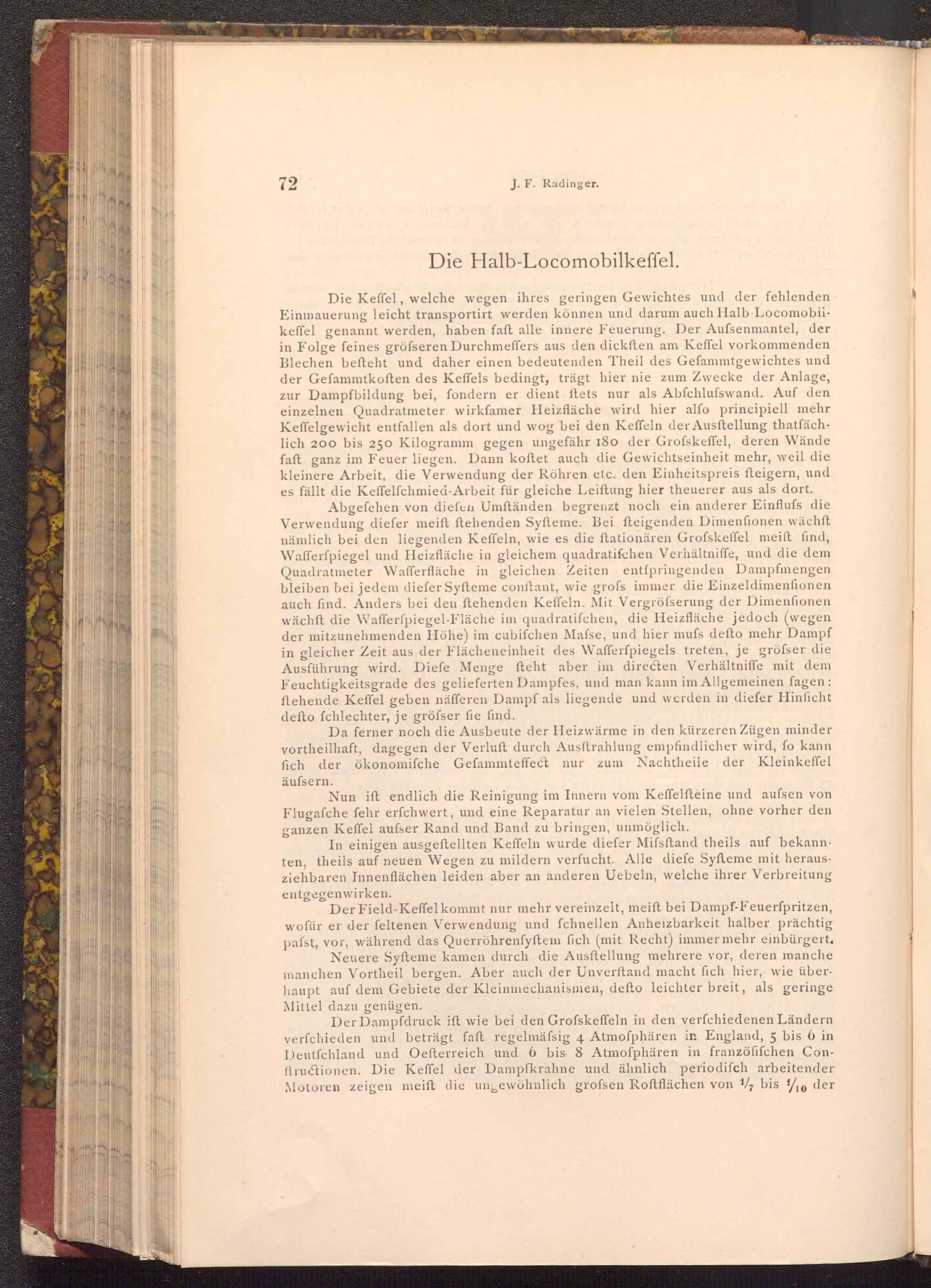 Der Dampfdruck ift wie bei den Grofskeffeln in den verfchiedenen Ländern verfchieden und beträgt faft regelmäfsig 4 Atmoſphären in England, 5 bis 6 in Deutfchland und Oefterreich und 6 bis 8 Atmoſphären in franzöfifchen Conftructionen. Die Keffel der Dampfkrahne und ähnlich periodifch arbeitender Motoren zeigen meift die ungewöhnlich grofsen Roftflächen von 1 bis 10 der