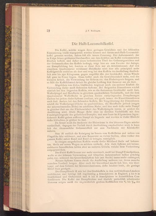 Die Keffel, welche wegen ihres geringen Gewichtes und der fehlenden Einmauerung leicht transportirt werden können und darum auch Halb Locomobiikeffel genannt werden, haben faft alle innere Feuerung. Der Aufsenmantel, der in Folge feines gröfseren Durchmeffers aus den dickften am Keffel vorkommenden Blechen befteht und daher einen bedeutenden Theil des Gefammtgewichtes und der Gefammtkoften des Keffels bedingt, trägt hier nie zum Zwecke der Anlage, zur Dampfbildung bei, fondern er dient ftets nur als Abfchlufswand. Auf den einzelnen Quadratmeter wirkfamer Heizfläche wird hier alfo principiell mehr Keffelgewicht entfallen als dort und wog bei den Keffeln der Ausftellung thatfächlich 200 bis 250 Kilogramm gegen ungefähr 180 der Grofskeffel, deren Wände faft ganz im Feuer liegen. Dann koftet auch die Gewichtseinheit mehr, weil die kleinere Arbeit, die Verwendung der Röhren etc. den Einheitspreis fteigern, und es fällt die Keffelfchmied- Arbeit für gleiche Leiftung hier theuerer aus als dort.