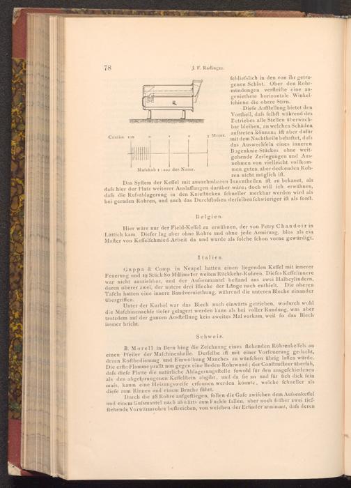 Guppa& Comp. in Neapel hatten einen liegenden Keffel mit innerer Feuerung und 19 Stück 80 Millimeter weiten Rückkehr- Rohren. Diefes Keffelinnere war nicht ausziehbar, und der Aufsenmantel beftand aus zwei Halbcylindern, Die oberen deren oberer zwei, der untere drei Bleche der Länge nach enthielt. Tafeln hatten eine innere Bandverniethung, während die unteren Bleche einander übergriffen.