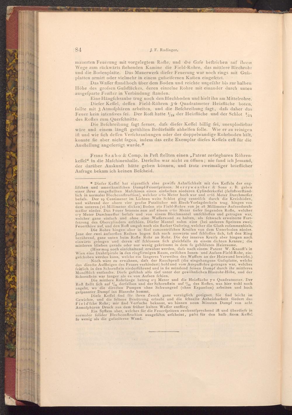 Diefe Keffel find für ihren Zweck ganz vorzüglich geeignet. Sie find leicht im Gewichte, und die feltene Benützung erlaubt und die fchnelle Anheizbarkeit fördert das Field'fche Rohr; mir find Verfuche bekannt, wo binnen neun Minuten Dampf von acht Atmoſphären Druck aus dem früher kalten Waffer entftieg.