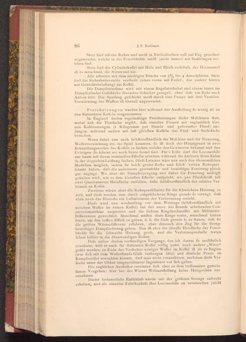 Diefs wird nun wochenlang vor dem Wetttage( felbftverftändlich mit weichem Waffer im reinen Keffel) bei der unter der Bremfe arbeitenden Concurrenzmafchine ausprobirt und die lichten Ringdurchmeffer mit MillimeterDifferenzen gewechfelt. Manchmal müffen diefe Ringe vorne, manchmal hinten fitzen, um den beften Effect zu geben, d. h. die Gafe gerade fo zu ftauen, dafs fie die gröfste Wärme differenz erfahren, aber dennoch den Zug für die ftrengbenöthigte Dampflieferung geben. Nun ift aber die directe Heizfläche der Feuerbüchfe für die fchwache Heizung grofs, und die Verbrennproducte treten fchon kühler in die dünnwandigen Rohre.