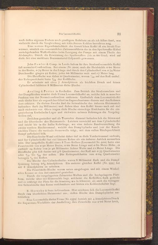 John Fowler& Comp. in Leeds haben für ihre Strafsenlocomobile Keffel faft normaler Conftruction. Bei einem( Nr. 2001) mafs die Heizbüchfe o 60 Meter in der Breite, o 79 Meter in der Länge und durch den Cylindertheil von o'74 Meter Durchmeffer gingen 22 Rohre, jedes 66 Millimeter weit und 17 Meter lang.