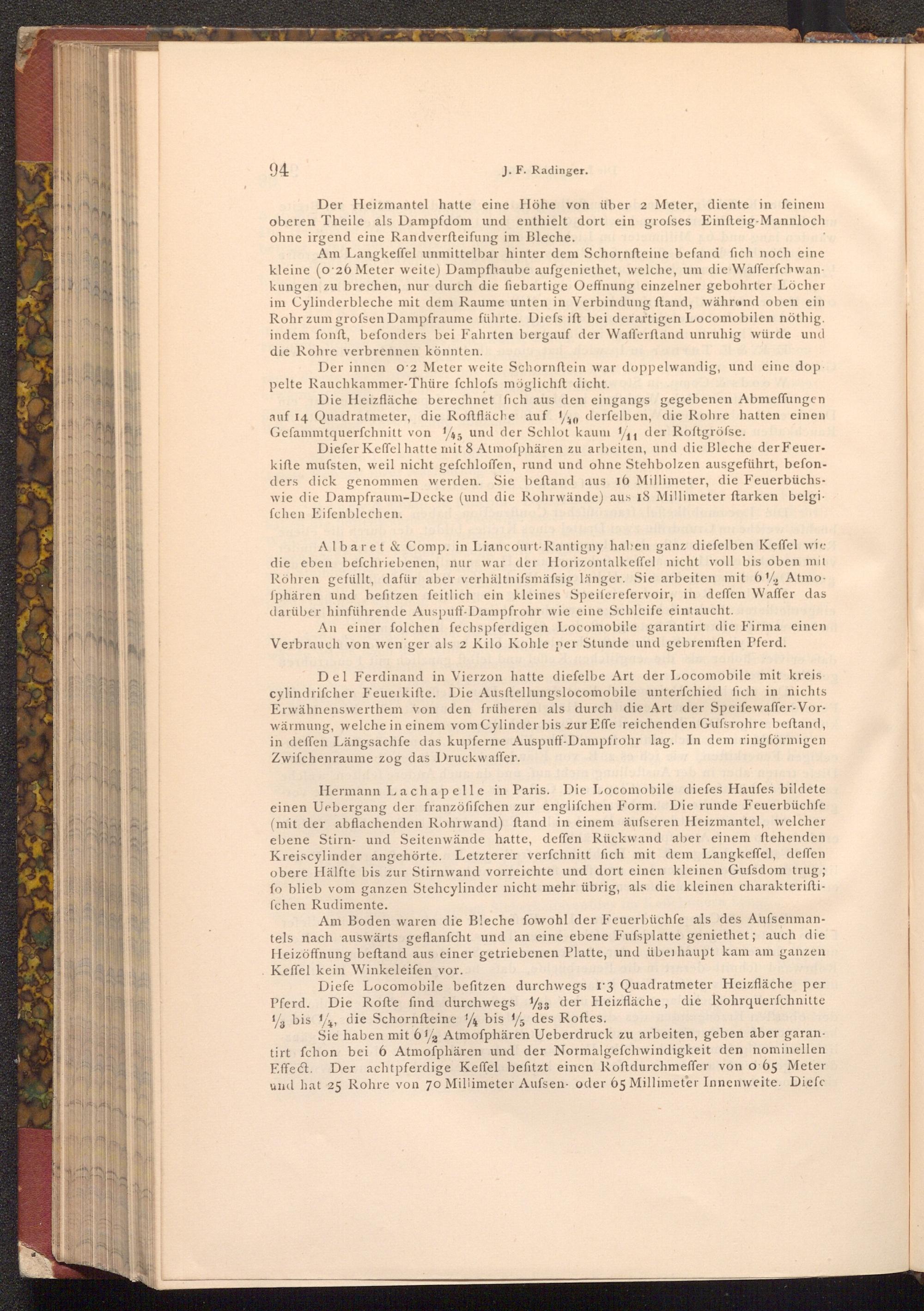 Hermann Lachapelle in Paris. Die Locomobile diefes Haufes bildete einen Uebergang der franzöfifchen zur englifchen Form. Die runde Feuerbüchfe ( mit der abflachenden Rohrwand) ftand in einem äufseren Heizmantel, welcher ebene Stirn- und Seitenwände hatte, deffen Rückwand aber einem ftehenden Kreiscylinder angehörte. Letzterer verfchnitt fich mit dem Langkeffel, deffen obere Hälfte bis zur Stirnwand vorreichte und dort einen kleinen Gufsdom trug; fo blieb vom ganzen Stehcylinder nicht mehr übrig, als die kleinen charakteriftifchen Rudimente.