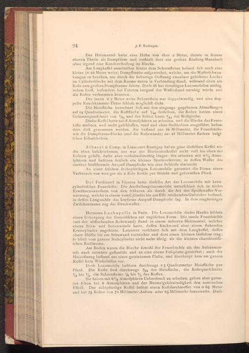 Del Ferdinand in Vierzon hatte diefelbe Art der Locomobile mit kreiscylindrifcher Feuerkifte. Die Ausftellungslocomobile unterfchied fich in nichts Erwähnenswerthem von den früheren als durch die Art der Speifewaffer- Vorwärmung, welche in einem vom Cylinder bis zur Effe reichenden Gufsrohre beftand, in deffen Längsachfe das kupferne Auspuff- Dampfrohr lag. In dem ringförmigen Zwifchenraume zog das Druckwaffer.