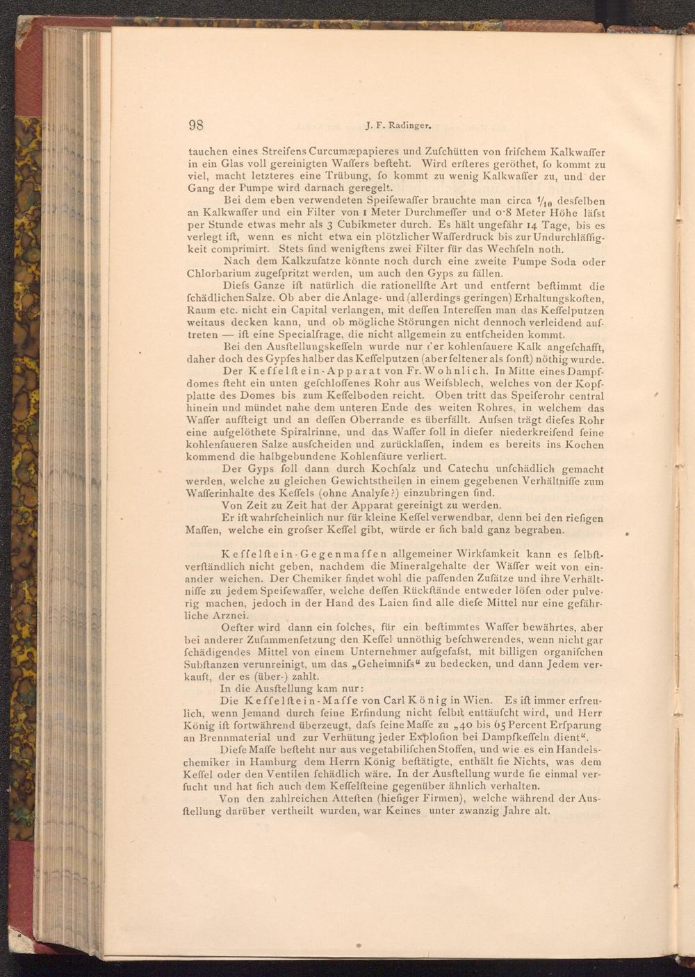 Die Keffelftein- Maffe von Carl König in Wien. Es ift immer erfreulich, wenn Jemand durch feine Erfindung nicht felbit enttäufcht wird, und Herr König ift fortwährend überzeugt, dafs feine Maffe zu„, 40 bis 65 Percent Erfparung an Brennmaterial und zur Verhütung jeder Exploſion bei Dampfkeffeln dient".
