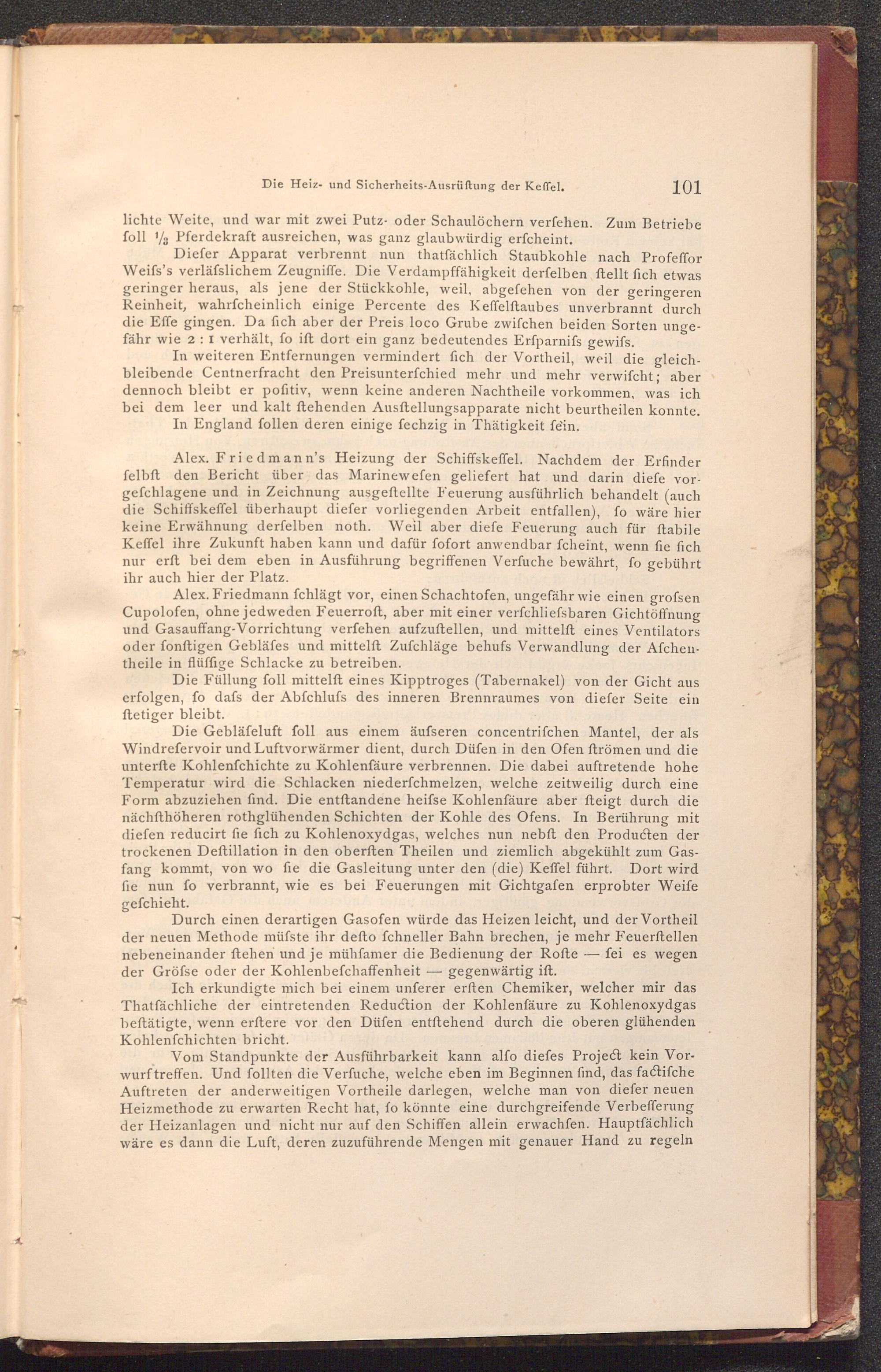 Alex. Friedmann's Heizung der Schiffskeffel. Nachdem der Erfinder felbft den Bericht über das Marinewefen geliefert hat und darin diefe vorgefchlagene und in Zeichnung ausgeftellte Feuerung ausführlich behandelt( auch die Schiffskeffel überhaupt diefer vorliegenden Arbeit entfallen), fo wäre hier keine Erwähnung derfelben noth. Weil aber diefe Feuerung auch für ftabile Keffel ihre Zukunft haben kann und dafür fofort anwendbar fcheint, wenn fie fich nur erft bei dem eben in Ausführung begriffenen Verfuche bewährt, fo gebührt ihr auch hier der Platz.