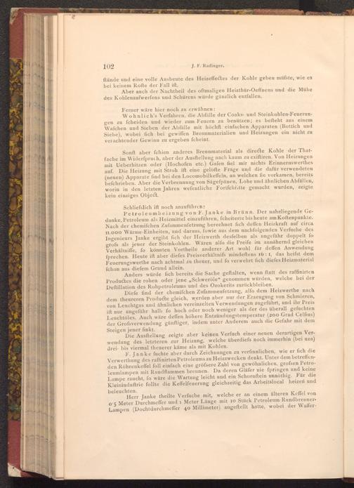 Petroleumheizung von F. Janke in Brünn. Der naheliegende Gedanke, Petroleum als Heizmittel einzuführen, fcheiterte bis heute am Koftenpunkte. Nach der chemifchen Zufammenfetzung berechnet fich deffen Heizkraft auf circa 11.000 Wärme- Einheiten, und daraus, fowie aus dem nachfolgenden Verfuche des Ingenieurs Janke ergibt fich der Heizwerth desfelben als ungefähr doppelt fo grofs als jener der Steinkohlen. Wären alfo die Preife im annähernd gleichen Verhältniffe, fo könnten Vortheile anderer Art wohl für deffen Anwendung fprechen. Heute ift aber diefes Preisverhältnifs mindeſtens 16: 1, das heifst dem Feuerungswerthe nach achtmal zu theuer, und fo verwehrt fich diefes Heizmaterial fchon aus diefem Grund allein.