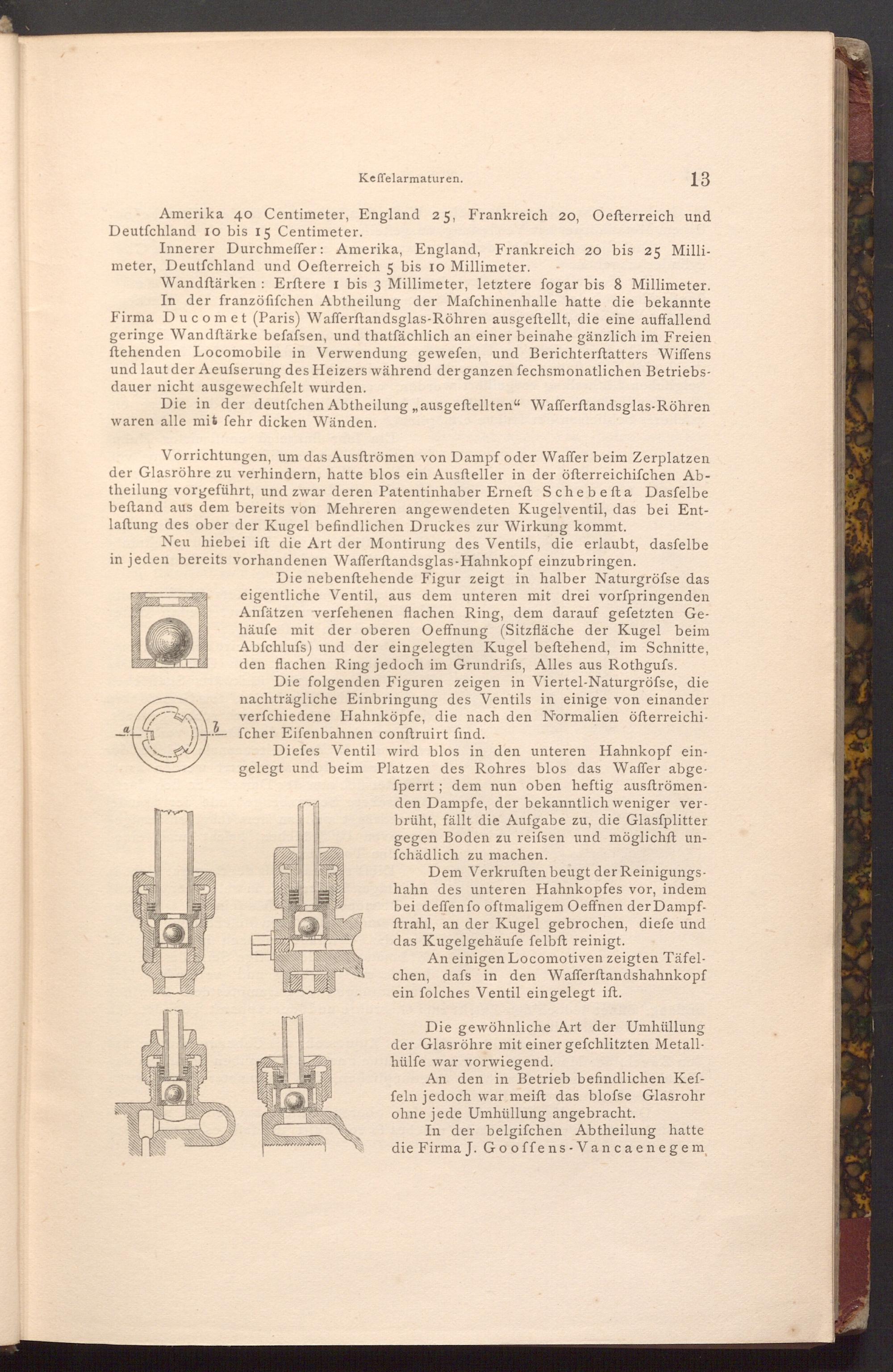 Vorrichtungen, um das Ausftrömen von Dampf oder Waffer beim Zerplatzen der Glasröhre zu verhindern, hatte blos ein Ausfteller in der öfterreichifchen Abtheilung vorgeführt, und zwar deren Patentinhaber Erneft Schebefta Dasfelbe beftand aus dem bereits von Mehreren angewendeten Kugelventil, das bei Entlaftung des ober der Kugel befindlichen Druckes zur Wirkung kommt.