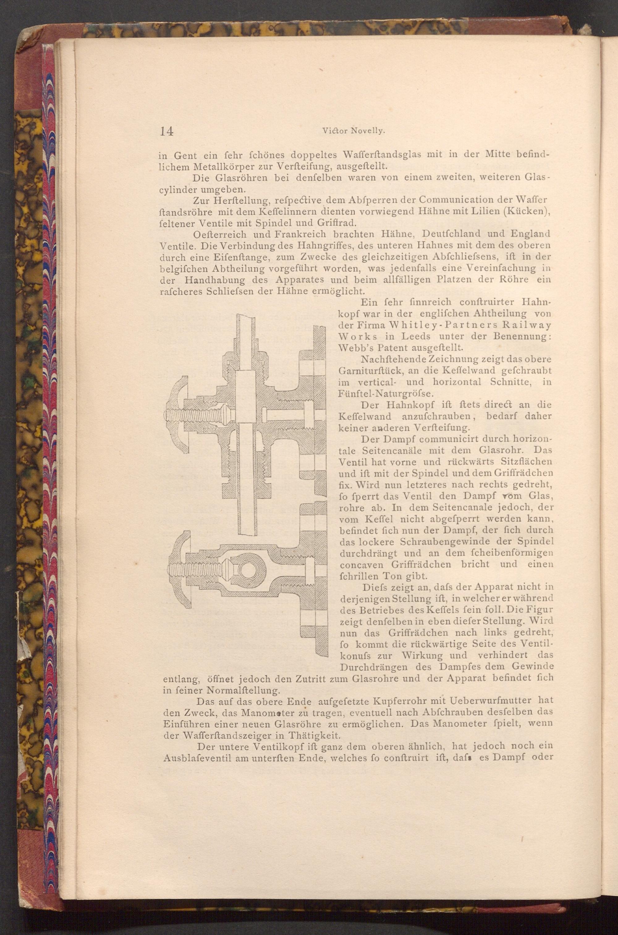 Diefs zeigt an, dafs der Apparat nicht in derjenigen Stellung ift, in welcher er während des Betriebes des Keffels fein foll. Die Figur zeigt denfelben in eben diefer Stellung. Wird nun das Griffrädchen nach links gedreht, fo kommt die rückwärtige Seite des Ventilkonufs zur Wirkung und verhindert das Durchdrängen des Dampfes dem Gewinde entlang, öffnet jedoch den Zutritt zum Glasrohre und der Apparat befindet fich in feiner Normalftellung.