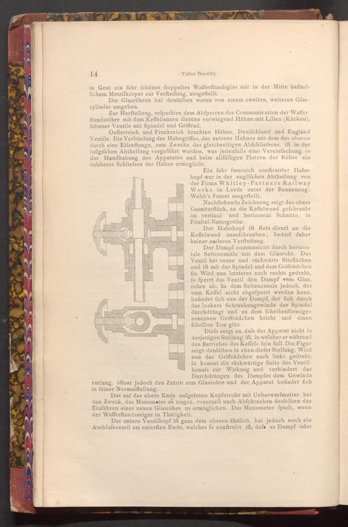 Der Dampf communicirt durch horizontale Seitencanäle mit dem Glasrohr. Das Ventil hat vorne und rückwärts Sitzflächen und ift mit der Spindel und dem Griffrädchen fix. Wird nun letzteres nach rechts gedreht, fo fperrt das Ventil den Dampf vom Glas, rohre ab. In dem Seitencanale jedoch, der vom Keffel nicht abgefperrt werden kann, befindet fich nun der Dampf, der fich durch das lockere Schraubengewinde der Spindel durchdrängt und an dem fcheibenförmigen concaven Griffrädchen bricht und einen fchrillen Ton gibt.