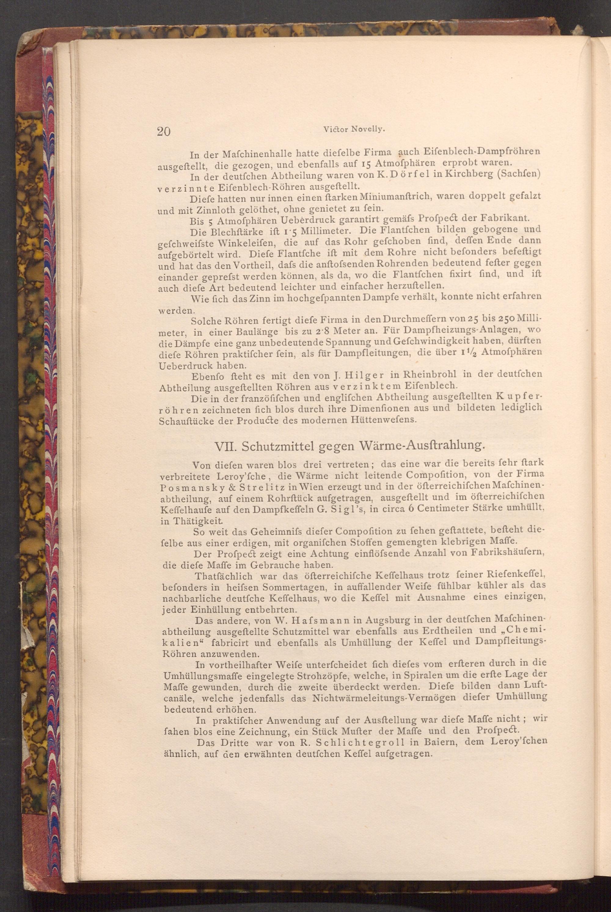 Von diefen waren blos drei vertreten; das eine war die bereits fehr ftark verbreitete Leroy'fche, die Wärme nicht leitende Compofition, von der Firma Posmansky& Strelitz in Wien erzeugt und in der öfterreichifchen Mafchinenabtheilung, auf einem Rohrftück aufgetragen, ausgeftellt und im öfterreichiſchen Keffelhaufe auf den Dampfkeffeln G. Sigl's, in circa 6 Centimeter Stärke umhüllt, in Thätigkeit.