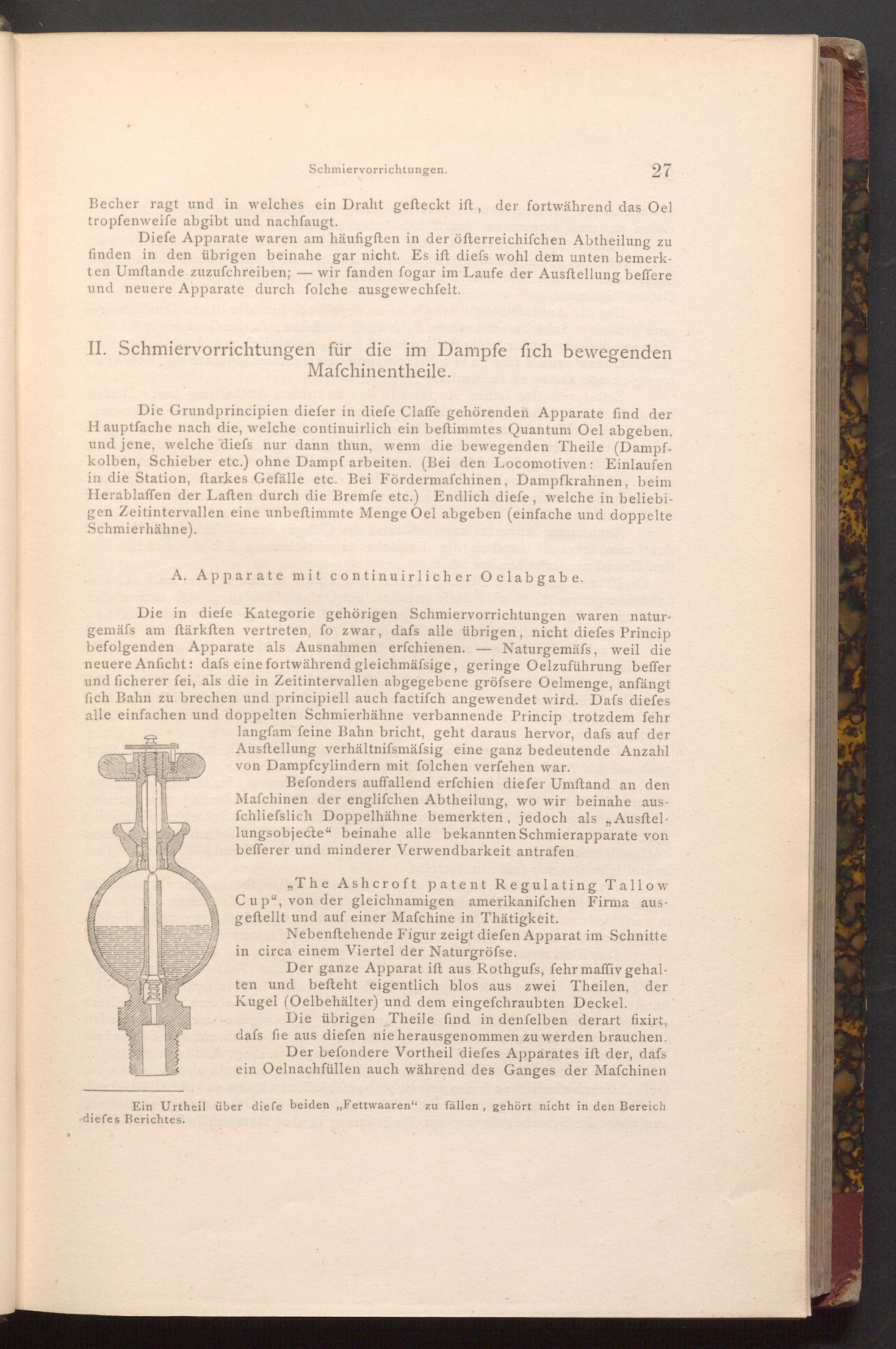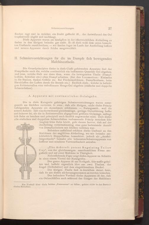 Die in diefe Kategorie gehörigen Schmiervorrichtungen waren naturgemäfs am ftärksten vertreten, fo zwar, dafs alle übrigen, nicht diefes Princip befolgenden Apparate als Ausnahmen erfchienen. Naturgemäfs, weil die neuere Anficht: dafs eine fortwährend gleichmäfsige, geringe Oelzuführung beffer und ficherer fei, als die in Zeitintervallen abgegebene gröfsere Oelmenge, anfängt fich Bahn zu brechen und principiell auch factifch angewendet wird. Dafs diefes alle einfachen und doppelten Schmierhähne verbannende Princip trotzdem fehr langfam feine Bahn bricht, geht daraus hervor, dafs auf der Ausftellung verhältnifsmäfsig eine ganz bedeutende Anzahl von Dampfcylindern mit folchen verfehen war.