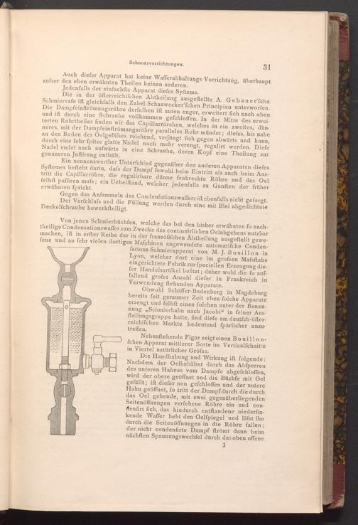 Ein nennenswerther Unterfchied gegenüber den anderen Apparaten diefes Syftemes befteht darin, dafs der Dampf fowohl beim Eintritt als auch beim Austritt die Capillarröhre, die regulirbare dünne fenkrechte Röhre und das Oel felbft paffiren mufs; ein Uebelftand, welcher jedenfalls zu Gunften der früher erwähnten fpricht.