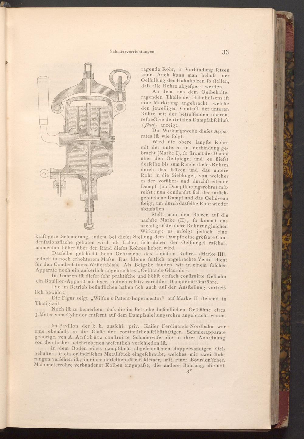 Im Pavillon der k. k. ausfchl. priv. Kaifer Ferdinands- Nordbahn war eine ebenfalls in die Claffe der continuirlich- felbftthätigen Schmierapparate gehörige, vcn A. Anfchütz conftruirte Schmiervafe, die in ihrer Anordnung von den bisher befchriebenen wefentlich verfchieden ift. shildis O sid