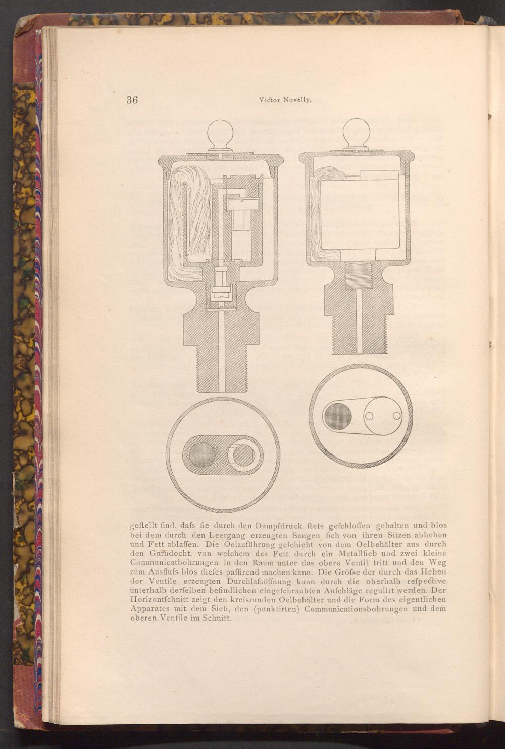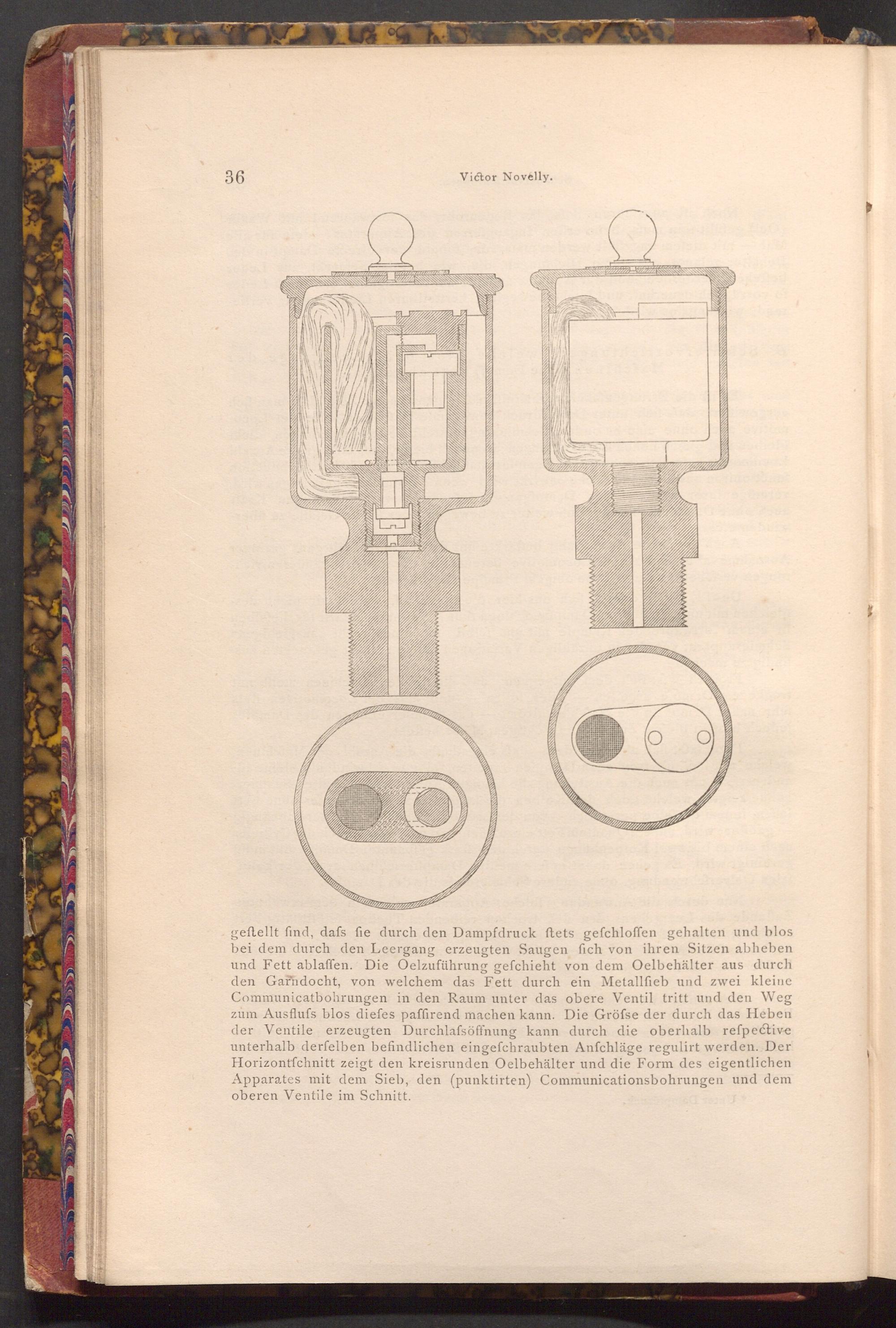 geftellt find, dafs fie durch den Dampfdruck ftets gefchloffen gehalten und blos bei dem durch den Leergang erzeugten Saugen fich von ihren Sitzen abheben und Fett ablaffen. Die Oelzuführung gefchieht von dem Oelbehälter aus durch den Garndocht, von welchem das Fett durch ein Metallfieb und zwei kleine Communicatbohrungen in den Raum unter das obere Ventil tritt und den Weg zum Ausflufs blos diefes paffirend machen kann. Die Gröfse der durch das Heben der Ventile erzeugten Durchlafsöffnung kann durch die oberhalb reſpective unterhalb derfelben befindlichen eingefchraubten Anfchläge regulirt werden. Der Horizontfchnitt zeigt den kreisrunden Oelbehälter und die Form des eigentlichen Apparates mit dem Sieb, den( punktirten) Communicationsbohrungen und dem oberen Ventile im Schnitt.