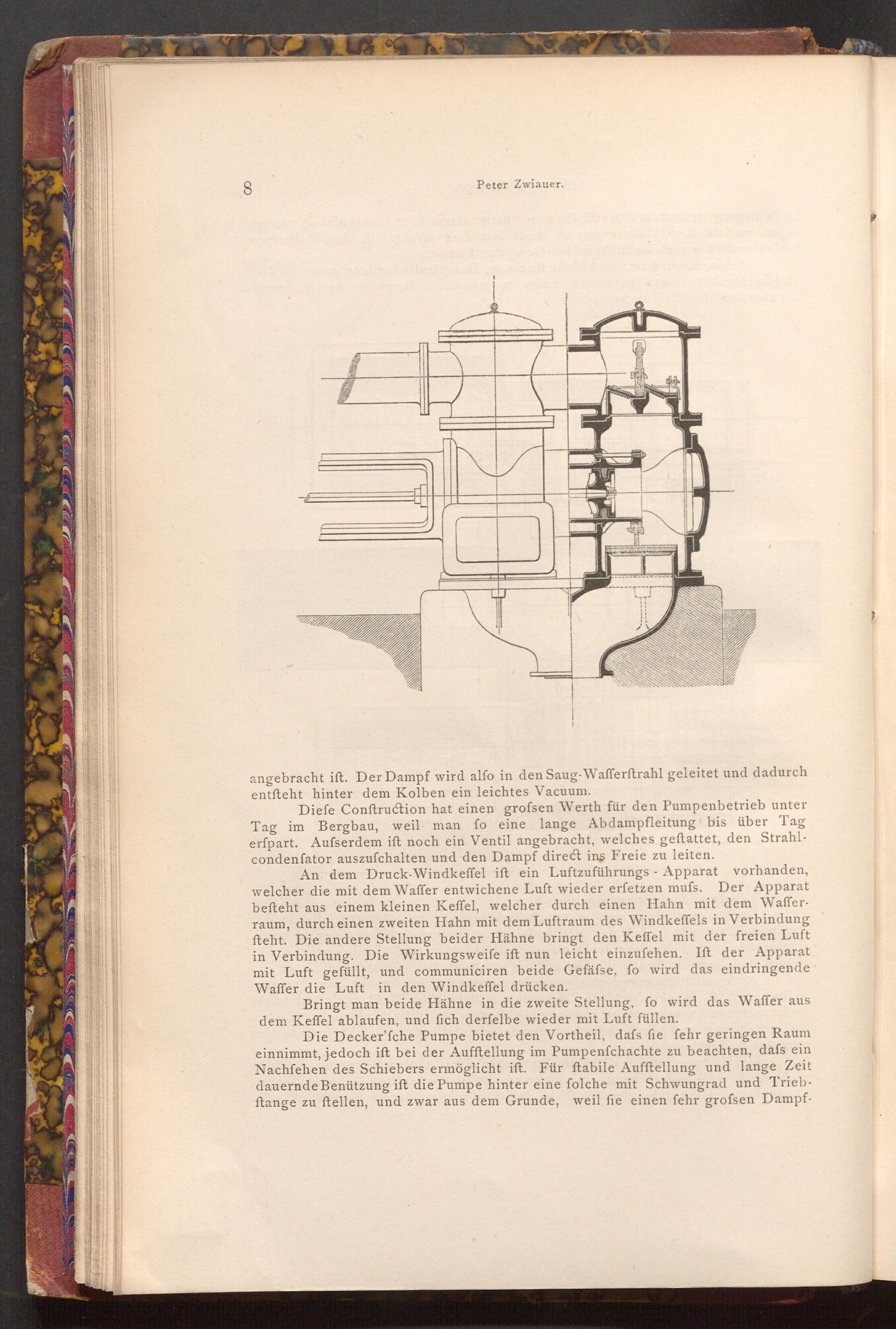 Die Decker'fche Pumpe bietet den Vortheil, dafs fie fehr geringen Raum einnimmt, jedoch ift bei der Aufftellung im Pumpenfchachte zu beachten, dafs ein Nachfehen des Schiebers ermöglicht ift. Für ftabile Aufftellung und lange Zeit dauernde Benützung ift die Pumpe hinter eine folche mit Schwungrad und Triebftange zu ftellen, und zwar aus dem Grunde, weil fie einen fehr grofsen Dampf